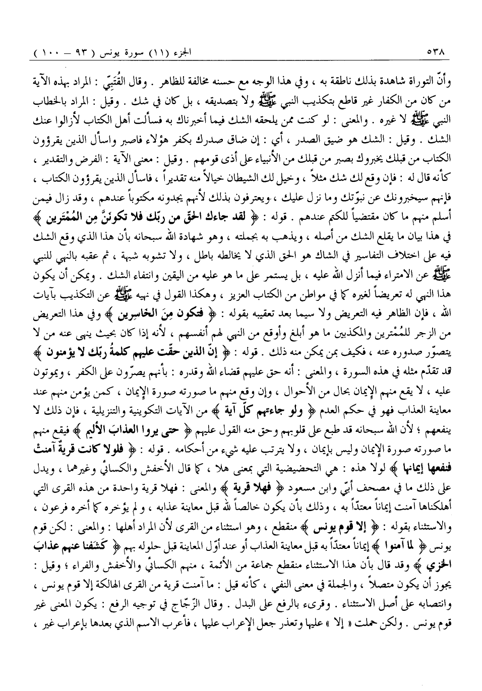 وَأَنَّ التَّوْرَاةَ شَاهِدَةٌ بِذَلِكَ نَاطِقَةٌ بِهِ، وَفِي هَذَا الْوَجْهِ مَعَ حُسْنِهِ مُخَالَفَةٌ لِلظَّاهِرِ. وَقَالَ القتبيّ: الْمُرَادُ بِهَذِهِ الْآيَةِ مَنْ كَانَ مِنَ الْكُفَّارِ غَيْرَ قَاطِعٍ بِتَكْذِيبِ النَّبِيِّ صَلَّى اللَّهُ عَلَيْهِ وَسَلَّمَ وَلَا بِتَصْدِيقِهِ، بَلْ كَانَ فِي شَكٍّ. وَقِيلَ: الْمُرَادُ بِالْخِطَابِ النَّبِيُّ صَلَّى اللَّهُ عَلَيْهِ وَسَلَّمَ لَا غَيْرُهُ. وَالْمَعْنَى: لَوْ كُنْتَ مِمَّنْ يَلْحَقُهُ الشَّكُّ فِيمَا أَخْبَرْنَاكَ بِهِ فَسَأَلْتَ أَهْلَ الْكِتَابِ لَأَزَالُوا عَنْكَ الشَّكَّ. وَقِيلَ: الشَّكُّ هُوَ ضِيقُ الصَّدْرِ، أَيْ: إِنْ ضَاقَ صَدْرُكَ بِكُفْرِ هَؤُلَاءِ فَاصْبِرْ وَاسْأَلِ الَّذِينَ يَقْرَءُونَ الْكِتَابَ مِنْ قَبْلِكَ يُخْبِرُوكَ بِصَبْرِ مَنْ قَبْلَكَ مِنَ الْأَنْبِيَاءِ عَلَى أَذَى قَوْمِهِمْ. وَقِيلَ: مَعْنَى الْآيَةِ: الْفَرْضُ وَالتَّقْدِيرُ، كَأَنَّهُ قَالَ لَهُ: فَإِنْ وَقَعَ لَكَ شَكٌّ مَثَلًا، وَخَيَّلَ لَكَ الشَّيْطَانُ خَيَالًا مِنْهُ تَقْدِيرًا، فَاسْأَلِ الَّذِينَ يَقْرَءُونَ الْكِتَابَ، فَإِنَّهُمْ سَيُخْبِرُونَكَ عَنْ نُبُوَّتِكَ وَمَا نَزَلَ عَلَيْكَ، وَيَعْتَرِفُونَ بِذَلِكَ لِأَنَّهُمْ يَجِدُونَهُ مَكْتُوبًا عِنْدَهُمْ، وَقَدْ زَالَ فِيمَنْ أسلم منهم ما كان مقتضيا للكتم عِنْدَهُمْ. قَوْلُهُ: لَقَدْ جاءَكَ الْحَقُّ مِنْ رَبِّكَ فَلا تَكُونَنَّ مِنَ المُمْتَرِينَ فِي هَذَا بَيَانُ مَا يَقْلَعُ الشَّكَّ مِنْ أَصْلِهِ، وَيَذْهَبُ بِهِ بِجُمْلَتِهِ، وَهُوَ شَهَادَةُ اللَّهِ سُبْحَانَهُ بِأَنَّ هَذَا الَّذِي وَقَعَ الشَّكُّ فِيهِ عَلَى اخْتِلَافِ التَّفَاسِيرِ فِي الشَّاكِّ هُوَ الْحَقُّ الَّذِي لَا يُخَالِطُهُ بَاطِلٌ، وَلَا تَشُوبُهُ شُبْهَةٌ، ثُمَّ عَقَّبَهُ بِالنَّهْيِ للنبي صلّى الله عليه وَسَلَّمَ عَنِ الِامْتِرَاءِ فِيمَا أَنْزَلَ اللَّهُ عَلَيْهِ، بَلْ يَسْتَمِرُّ عَلَى مَا هُوَ عَلَيْهِ مِنَ الْيَقِينِ وَانْتِفَاءِ الشَّكِّ. وَيُمْكِنُ أَنْ يَكُونَ هَذَا النَّهْيُ لَهُ تَعْرِيضًا لِغَيْرِهِ كَمَا فِي مَوَاطِنَ مِنَ الْكِتَابِ الْعَزِيزِ، وَهَكَذَا الْقَوْلُ فِي نَهْيِهِ صلّى الله عليه وَسَلَّمَ عَنِ التَّكْذِيبِ بِآيَاتِ اللَّهِ، فَإِنَّ الظَّاهِرَ فِيهِ التَّعْرِيضُ وَلَا سِيَّمَا بَعْدَ تَعْقِيبِهِ بِقَوْلِهِ: فَتَكُونَ مِنَ الْخاسِرِينَ وَفِي هَذَا التَّعْرِيضِ مِنَ الزَّجْرِ لِلْمُمْتَرِينَ وَالْمُكَذِّبِينَ مَا هُوَ أَبْلَغُ وَأَوْقَعُ مِنَ النَّهْيِ لَهُمْ أَنْفُسِهِمْ، لِأَنَّهُ إِذَا كَانَ بِحَيْثُ يُنْهَى عَنْهُ مَنْ لَا يُتَصَوَّرُ صُدُورُهُ عَنْهُ، فَكَيْفَ بِمَنْ يُمْكِنُ مِنْهُ ذَلِكَ. قَوْلُهُ: إِنَّ الَّذِينَ حَقَّتْ عَلَيْهِمْ كَلِمَتُ رَبِّكَ لَا يُؤْمِنُونَ قَدْ تَقَدَّمَ مِثْلُهُ فِي هَذِهِ السُّورَةِ، وَالْمَعْنَى: أَنَّهُ حَقٌّ عَلَيْهِمْ قَضَاءُ اللَّهِ وَقَدَرُهُ: بِأَنَّهُمْ يُصِرُّونَ عَلَى الْكُفْرِ، وَيَمُوتُونَ عَلَيْهِ، لَا يَقَعُ مِنْهُمُ الْإِيمَانُ بِحَالٍ مِنَ الْأَحْوَالِ، وَإِنْ وَقَعَ