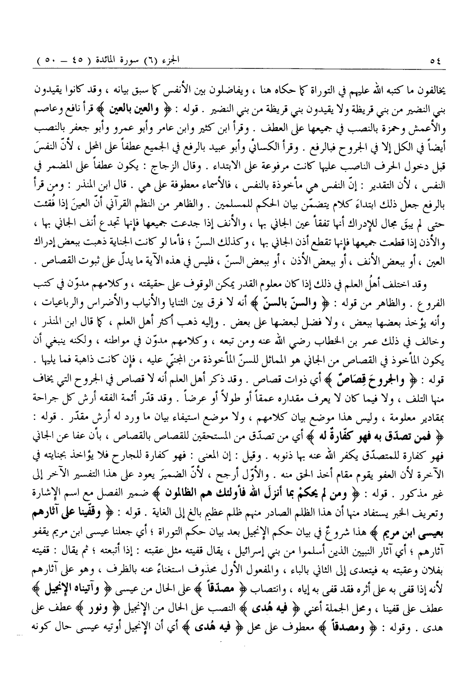 فَمَنْ تَصَدَّقَ بِهِ فَهُوَ كَفَّارَةٌ لَهُ أَيْ مَنْ تَصَدَّقَ مِنَ الْمُسْتَحِقِّينَ لِلْقِصَاصِ بِالْقِصَاصِ، بِأَنْ عَفَا عَنِ الْجَانِي فَهُوَ كَفَّارَةٌ لِلْمُتَصَدِّقِ يُكَفِّرُ اللَّهُ عَنْهُ بِهَا ذُنُوبَهُ. وَقِيلَ: إِنَّ الْمَعْنَى: فَهُوَ كَفَّارَةٌ لِلْجَارِحِ فَلَا يُؤَاخَذُ بِجِنَايَتِهِ فِي الْآخِرَةِ لِأَنَّ الْعَفْوَ يَقُومُ مَقَامَ أَخْذِ الْحَقِّ مِنْهُ. وَالْأَوَّلُ أَرْجَحُ، لِأَنَّ الضَّمِيرَ يَعُودُ عَلَى هَذَا التَّفْسِيرِ الْآخَرِ إِلَى غَيْرِ مَذْكُورٍ. قَوْلُهُ: وَمَنْ لَمْ يَحْكُمْ بِما أَنْزَلَ اللَّهُ فَأُولئِكَ هُمُ الظَّالِمُونَ ضَمِيرُ الْفَصْلِ مَعَ اسْمِ الْإِشَارَةِ وَتَعْرِيفُ الْخَبَرِ يُسْتَفَادُ مِنْهَا أَنَّ هَذَا الظُّلْمَ الصَّادِرَ مِنْهُمْ ظُلْمٌ عَظِيمٌ بَالِغٌ إِلَى الْغَايَةِ. قَوْلُهُ: وَقَفَّيْنا عَلى آثارِهِمْ بِعِيسَى ابْنِ مَرْيَمَ هَذَا شُرُوعٌ فِي بَيَانِ حُكْمِ الْإِنْجِيلِ بَعْدَ بَيَانِ حُكْمِ التَّوْرَاةِ أَيْ جَعَلَنَا عِيسَى ابْنَ مَرْيَمَ يَقْفُو آثَارَهُمْ أَيْ آثَارَ النَّبِيِّينَ الَّذِينَ أَسْلَمُوا مِنْ بَنِي إِسْرَائِيلَ، يُقَالُ قَفَّيْتُهُ مِثْلَ عَقَّبْتُهُ: إِذَا أَتْبَعْتَهُ ثُمَّ يُقَالُ: قَفَّيْتُهُ بِفُلَانٍ وَعَقَّبْتُهُ بِهِ فَيَتَعَدَّى إِلَى الثَّانِي بِالْبَاءِ، وَالْمَفْعُولُ الْأَوَّلُ مَحْذُوفٌ اسْتِغْنَاءً عَنْهُ بِالظَّرْفِ، وَهُوَ عَلَى آثَارِهِمْ لِأَنَّهُ إِذَا قَفَّى بِهِ عَلَى أَثَرِهِ فَقَدْ قَفَّى بِهِ إِيَّاهُ، وَانْتِصَابُ مُصَدِّقاً عَلَى الْحَالِ مِنْ عِيسَى وَآتَيْناهُ الْإِنْجِيلَ عَطْفٌ عَلَى قَفَّيْنَا، وَمَحَلُّ الْجُمْلَةِ أَعْنِي فِيهِ هُدىً النَّصْبُ عَلَى الْحَالِ مِنَ الْإِنْجِيلِ وَنُورٌ عَطْفٌ عَلَى هُدًى. وَقَوْلُهُ: وَمُصَدِّقاً مَعْطُوفٌ عَلَى مَحَلِّ فِيهِ هُدىً أَيْ إِنَّ الْإِنْجِيلَ أُوتِيَهُ عِيسَى حَالَ كَوْنِهِ