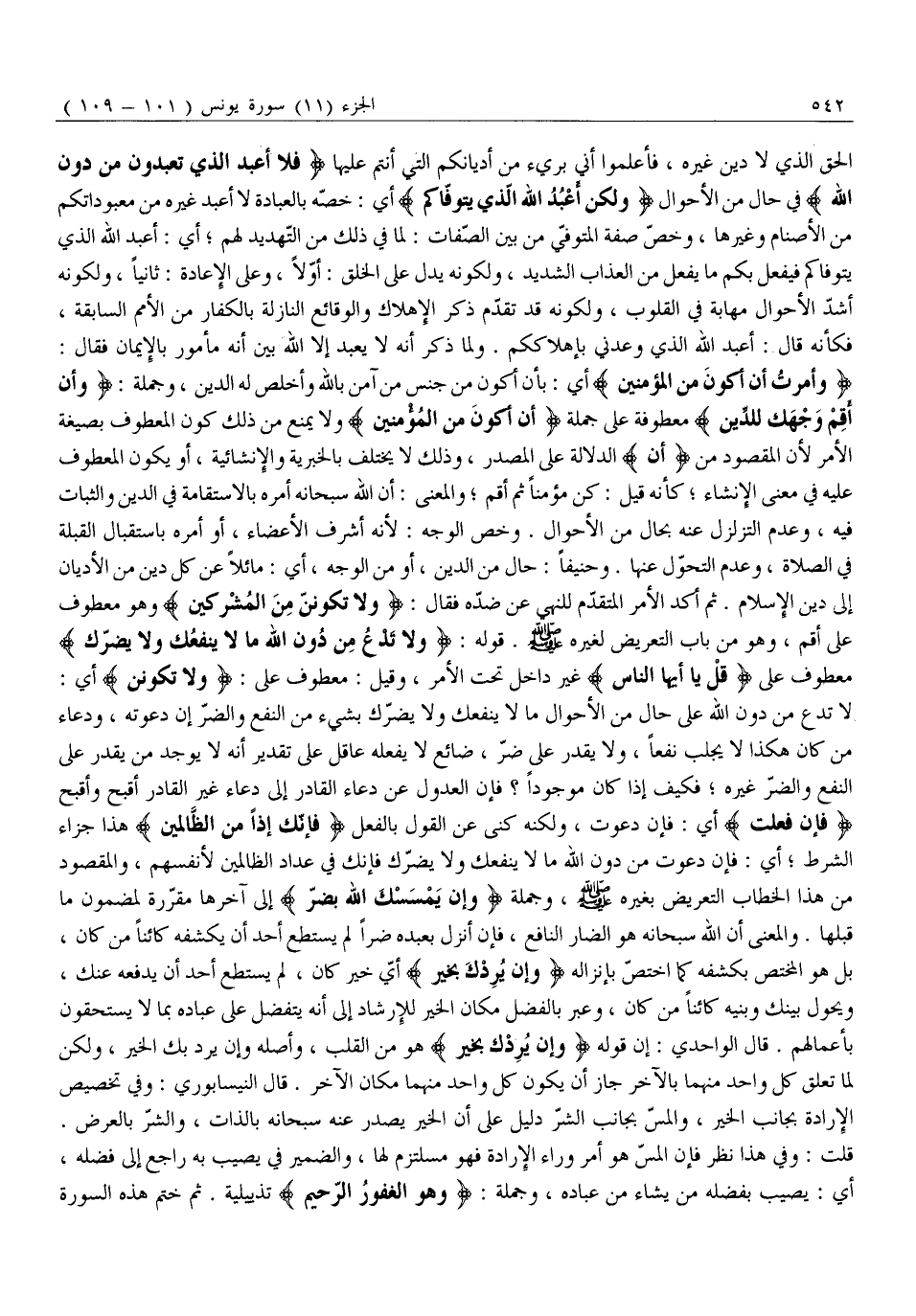 الْحَقُّ الَّذِي لَا دِينَ غَيْرُهُ، فَاعْلَمُوا أَنِّي بَرِيءٌ مِنْ أَدْيَانِكُمُ الَّتِي أَنْتُمْ عَلَيْهَا فَلا أَعْبُدُ الَّذِينَ تَعْبُدُونَ مِنْ دُونِ اللَّهِ فِي حَالٍ مِنَ الْأَحْوَالِ وَلكِنْ أَعْبُدُ اللَّهَ الَّذِي يَتَوَفَّاكُمْ أي: خصّه بِالْعِبَادَةِ لَا أَعْبُدُ غَيْرَهُ مِنْ مَعْبُودَاتِكُمْ مِنَ الْأَصْنَامِ وَغَيْرِهَا، وَخَصَّ صِفَةَ الْمُتَوَفِّي مِنْ بَيْنِ الصِّفَاتِ: لِمَا فِي ذَلِكَ مِنَ التَّهْدِيدِ لَهُمْ أَيْ: أَعْبُدُ اللَّهَ الَّذِي يَتَوَفَّاكُمْ فَيَفْعَلُ بِكُمْ مَا يَفْعَلُ مِنَ الْعَذَابِ الشَّدِيدِ، وَلِكَوْنِهِ يَدُلُّ عَلَى الْخَلْقِ: أَوَّلًا، وَعَلَى الْإِعَادَةِ: ثَانِيًا، وَلِكَوْنِهِ أَشَدَّ الْأَحْوَالِ مَهَابَةً فِي الْقُلُوبِ، وَلِكَوْنِهِ قَدْ تَقَدَّمَ ذِكْرُ الْإِهْلَاكِ وَالْوَقَائِعِ النَّازِلَةِ بِالْكُفَّارِ مِنَ الْأُمَمِ السَّابِقَةِ، فَكَأَنَّهُ قَالَ: أَعْبُدُ اللَّهَ الَّذِي وَعَدَنِي بِإِهْلَاكِكُمْ. وَلَمَّا ذَكَرَ أَنَّهُ لَا يَعْبُدُ إِلَّا اللَّهَ بَيَّنَ أَنَّهُ مَأْمُورٌ بِالْإِيمَانِ فَقَالَ: