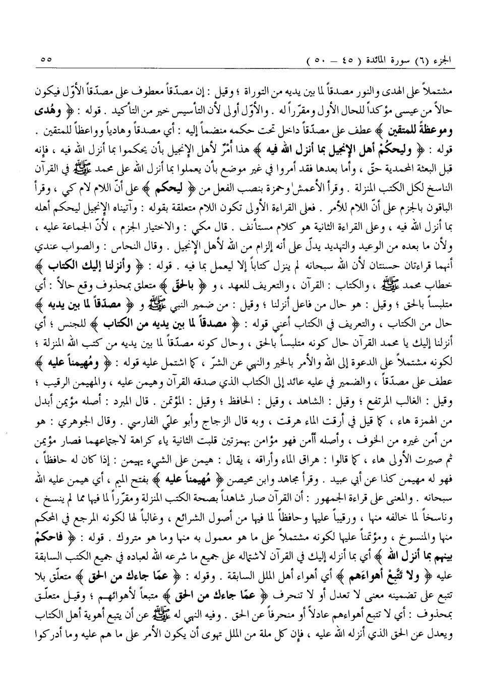 قَوْلُهُ: وَلْيَحْكُمْ أَهْلُ الْإِنْجِيلِ بِما أَنْزَلَ اللَّهُ فِيهِ هَذَا أَمْرٌ لِأَهْلِ الْإِنْجِيلِ بِأَنْ يُحَكِّمُوا بِمَا أَنْزَلَ اللَّهُ فِيهِ، فَإِنَّهُ قَبْلَ الْبَعْثَةِ الْمُحَمَّدِيَّةِ حَقٌّ، وَأَمَّا بَعْدَهَا فَقَدْ أُمِرُوا فِي غَيْرِ مَوْضِعٍ بِأَنْ يَعْمَلُوا بِمَا أَنْزَلَ اللَّهُ عَلَى مُحَمَّدٍ صَلَّى اللَّهُ عليه وَسَلَّمَ فِي الْقُرْآنِ النَّاسِخِ لِكُلِّ الْكُتُبِ الْمُنَزَّلَةِ. وقرأ الأعمش وحمزة بنصب الفعل من لْيَحْكُمْ عَلَى أَنَّ اللَّامَ لَامُ كَيْ، وَقَرَأَ الْبَاقُونَ بِالْجَزْمِ عَلَى أَنَّ اللَّامَ لِلْأَمْرِ. فَعَلَى الْقِرَاءَةِ الْأُولَى تَكُونُ اللَّامُ مُتَعَلِّقَةً بِقَوْلِهِ: وَآتَيْنَاهُ الْإِنْجِيلَ لِيَحْكُمَ أَهْلُهُ بِمَا أَنْزَلَ اللَّهُ فِيهِ، وَعَلَى الْقِرَاءَةِ الثَّانِيَةِ هُوَ كَلَامٌ مُسْتَأْنَفٌ. قَالَ مَكِّيٌّ: وَالِاخْتِيَارُ الْجَزْمُ، لِأَنَّ الْجَمَاعَةَ عَلَيْهِ، وَلِأَنَّ مَا بَعْدَهُ مِنَ الْوَعِيدِ وَالتَّهْدِيدِ يَدُلُّ عَلَى أَنَّهُ إِلْزَامٌ مِنَ اللَّهِ لِأَهْلِ الْإِنْجِيلِ. وَقَالَ النَّحَّاسُ: وَالصَّوَابُ عِنْدِي أَنَّهُمَا قِرَاءَتَانِ حَسَنَتَانِ لِأَنَّ اللَّهَ سُبْحَانَهُ لَمْ يُنْزِّلْ كِتَابًا إِلَّا لِيُعْمَلَ بِمَا فيه. قوله: وَأَنْزَلْنا إِلَيْكَ الْكِتابَ خطاب محمد صلّى الله عليه وسلّم، والكتاب: القرآن، والتعريف للعهد، وبِالْحَقِّ مُتَعَلِّقٌ بِمَحْذُوفٍ وَقَعَ حَالًا: أَيْ مُتَلَبِّسًا بِالْحَقِّ وَقِيلَ: هُوَ حَالٌ مِنْ فَاعِلِ أَنْزَلْنَا وَقِيلَ: من ضمير النبي صلّى الله عليه وسلّم ومُصَدِّقاً لِما بَيْنَ يَدَيْهِ حَالٌ مِنَ الْكِتَابِ، وَالتَّعْرِيفُ فِي الْكِتَابِ أَعْنِي قَوْلَهُ: مُصَدِّقاً لِما بَيْنَ يَدَيْهِ مِنَ الْكِتابِ لِلْجِنْسِ أَيْ أَنْزَلْنَا إِلَيْكَ يَا مُحَمَّدُ الْقُرْآنَ حَالَ كَوْنِهِ مُتَلَبِّسًا بِالْحَقِّ، وَحَالَ كَوْنِهِ مُصَدِّقًا لِمَا بَيْنَ يَدَيْهِ مِنْ كُتُبِ اللَّهِ الْمُنَزَّلَةِ لِكَوْنِهِ مُشْتَمِلًا عَلَى الدَّعْوَةِ إِلَى اللَّهِ وَالْأَمْرِ بِالْخَيْرِ وَالنَّهْيِ عَنِ الشَّرِّ، كَمَا اشْتَمَلَ عَلَيْهِ قَوْلُهُ: وَمُهَيْمِناً عَلَيْهِ عَطْفٌ عَلَى مُصَدِّقًا، وَالضَّمِيرُ فِي عَلَيْهِ عَائِدٌ إِلَى الْكِتَابِ الَّذِي صَدَّقَهُ الْقُرْآنُ وَهَيْمَنَ عَلَيْهِ، وَالْمُهَيْمِنُ الرَّقِيبُ وَقِيلَ: الْغَالِبُ الْمُرْتَفِعُ وَقِيلَ: الشَّاهِدُ، وَقِيلَ: الْحَافِظُ وَقِيلَ: الْمُؤْتَمَنُ. قَالَ الْمُبَرِّدُ: أَصْلُهُ مُؤَيْمَنٌ أُبْدِلَ مِنَ الْهَمْزَةِ هَاءٌ، كَمَا قِيلَ فِي أَرَقْتُ الْمَاءَ هَرَقْتُ، وَبِهِ قَالَ الزَّجَّاجُ وَأَبُو عَلِيٍّ الْفَارِسِيُّ. وَقَالَ الْجَوْهَرِيُّ: هُوَ مِنْ أَمِنَ غَيْرَهُ مِنَ الْخَوْفِ، وَأَصْلُهُ أَأْمَنَ فَهُوَ مُؤَأْمِنٌ بِهَمْزَتَيْنِ قُلِبَتِ الثَّانِيَةُ يَاءً كَرَاهَةً لِاجْتِمَاعِهِمَا فَصَارَ مُؤَيْمَنٌ ثُمَّ صُيِّرَتِ الْأُولَى هَاءً، كَمَا قَالُوا: هَرَاقَ الْمَاءَ وَأَرَاقَهُ، يُقَالُ: هَيْمَنَ عَلَى الشَّيْءِ يُهَيْمِنُ: إِذَا كَانَ لَهُ حَافِظًا، فَهُوَ لَهُ مُهَيْمِنٌ كَذَا عَنْ أَبِي عُبَيْدٍ. وَقَرَأَ مُجَاهِدٌ وَابْنُ مُحَيْصِنٍ مُهَيْمِناً عَلَيْهِ بِفَتْحِ الْمِيمِ، أَيْ هَيْمَنَ عَلَيْهِ اللَّهُ سُبْحَانَهُ. وَالْمَعْنَى عَلَى قِرَاءَةِ الْجُمْهُورِ: أَنَّ الْقُرْآنَ صَارَ شَاهِدًا بِصِحَّةِ الْكُتُبِ الْمُنَزَّلَةِ وَمُقَرِّرًا لِمَا فِيهَا مِمَّا لَمْ يُنْسَخْ، وَنَاسِخًا لِمَا خَالَفَهُ مِنْهَا، وَرَقِيبًا عَلَيْهَا وَحَافِظًا لِمَا فِيهَا مِنْ أُصُولِ الشَّرَائِعِ، وَغَالِبًا لَهَا لِكَوْنِهِ الْمَرْجِعَ فِي الْمُحْكَمِ مِنْهَا وَالْمَنْسُوخِ، وَمُؤْتَمَنً