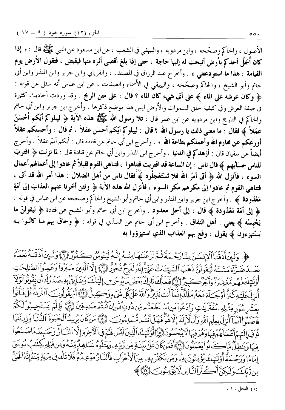 وَكانَ عَرْشُهُ عَلَى الْماءِ عَلَى أَيِّ شَيْءٍ كَانَ الْمَاءُ؟ قَالَ: عَلَى مَتْنِ الرِّيحِ. وَقَدْ وَرَدَتْ أَحَادِيثُ كَثِيرَةٌ في صفة العرش وفي كيفية خلق السموات وَالْأَرْضِ لَيْسَ هَذَا مَوْضِعُ ذِكْرِهَا. وَأَخْرَجَ ابْنُ جَرِيرٍ وَابْنُ أَبِي حَاتِمٍ وَالْحَاكِمُ فِي التَّارِيخِ وَابْنُ مَرْدَوَيْهِ عَنِ ابْنِ عُمَرَ قَالَ: تَلَا رَسُولُ اللَّهِ صَلَّى اللَّهُ عَلَيْهِ وَسَلَّمَ هَذِهِ الْآيَةَ لِيَبْلُوَكُمْ أَيُّكُمْ أَحْسَنُ عَمَلًا فقال: مَا مَعْنَى ذَلِكَ يَا رَسُولَ اللَّهِ؟ قَالَ: لِيَبْلُوَكُمْ أَيُّكُمْ أَحْسَنُ عَقْلًا، ثُمَّ قَالَ: وَأَحْسَنُكُمْ عَقْلًا أَوْرَعُكُمْ عَنْ مَحَارِمِ اللَّهِ وَأَعْمَلُكُمْ بِطَاعَةِ اللَّهِ» . وَأَخْرَجَ ابْنُ أَبِي حَاتِمٍ عَنْ قَتَادَةَ قَالَ: أَيُّكُمْ أَتَمُّ عَقْلًا. وَأَخْرَجَ أَيْضًا عَنْ سُفْيَانَ قَالَ: أَزْهَدُكُمْ فِي الدُّنْيَا. وَأَخْرَجَ ابْنُ الْمُنْذِرِ وَابْنُ أَبِي حَاتِمٍ عَنْ قَتَادَةَ قَالَ: لما نزلت اقْتَرَبَ لِلنَّاسِ حِسابُهُمْ قَالَ نَاسٌ: إِنِ السَّاعَةَ قَدِ اقْتَرَبَتْ فَتَنَاهَوْا، فَتَنَاهَى الْقَوْمُ قَلِيلًا ثُمَّ عَادُوا إِلَى أَعْمَالِهِمْ أَعْمَالِ السُّوءِ، فَأَنْزَلَ اللَّهُ أَتى أَمْرُ اللَّهِ فَلا تَسْتَعْجِلُوهُ «1» فَقَالَ نَاسٌ مِنْ أَهْلِ الضَّلَالِ: هَذَا أَمْرُ اللَّهِ قَدْ أَتَى، فَتَنَاهَى الْقَوْمُ ثُمَّ عَادُوا إِلَى مَكْرِهِمْ مَكْرِ السَّوْءِ، فَأَنْزَلَ اللَّهُ هَذِهِ الْآيَةَ وَلَئِنْ أَخَّرْنا عَنْهُمُ الْعَذابَ إِلى أُمَّةٍ مَعْدُودَةٍ. وَأَخْرَجَ ابْنُ جَرِيرٍ وَابْنُ الْمُنْذِرِ وَابْنُ أَبِي حَاتِمٍ وَأَبُو الشَّيْخِ وَالْحَاكِمُ وَصَحَّحَهُ عَنِ ابْنِ عَبَّاسٍ فِي قَوْلِهِ: