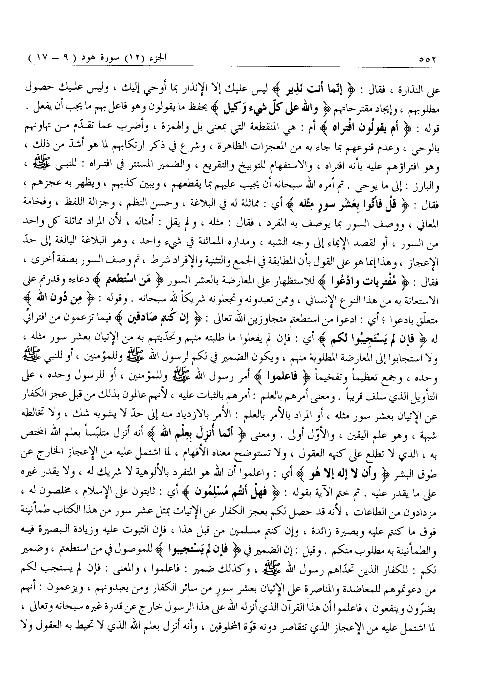 قَوْلُهُ: أَمْ يَقُولُونَ افْتَراهُ أَمْ: هِيَ الْمُنْقَطِعَةُ الَّتِي بِمَعْنَى بَلْ وَالْهَمْزَةُ، وَأَضْرَبَ عَمَّا تَقَدَّمَ مِنْ تَهَاوُنِهِمْ بِالْوَحْيِ، وَعَدَمِ قُنُوعِهِمْ بِمَا جَاءَ بِهِ مِنَ الْمُعْجِزَاتِ الظَّاهِرَةِ، وَشَرَعَ فِي ذِكْرِ ارْتِكَابِهِمْ لِمَا هُوَ أَشَدُّ مِنْ ذَلِكَ، وَهُوَ افْتِرَاؤُهُمْ عَلَيْهِ بِأَنَّهُ افْتَرَاهُ، وَالِاسْتِفْهَامُ لِلتَّوْبِيخِ وَالتَّقْرِيعِ، وَالضَّمِيرُ الْمُسْتَتِرُ فِي افْتَرَاهُ: لِلنَّبِيِّ صلّى الله عليه وَسَلَّمَ، وَالْبَارِزُ: إِلَى مَا يُوحَى. ثُمَّ أَمَرَهُ اللَّهُ سُبْحَانَهُ أَنْ يُجِيبَ عَلَيْهِمْ بِمَا يُقْطِعَهُمْ، وَيُبَيِّنُ كَذِبَهُمْ، وَيُظْهِرُ بِهِ عَجْزَهُمْ، فَقَالَ: قُلْ فَأْتُوا بِعَشْرِ سُوَرٍ مِثْلِهِ أَيْ: مُمَاثَلَةٍ لَهُ فِي الْبَلَاغَةِ، وَحُسْنِ النَّظْمِ، وَجَزَالَةِ اللَّفْظِ، وَفَخَامَةِ الْمَعَانِي، وَوَصْفِ السُّوَرِ بِمَا يُوصَفُ بِهِ الْمُفْرَدُ، فقال: مثله، وَلَمْ يَقُلْ: أَمْثَالَهُ، لِأَنَّ الْمُرَادَ مُمَاثَلَةُ كُلِّ وَاحِدٍ مِنَ السُّوَرِ، أَوْ لِقَصْدِ الْإِيمَاءِ إِلَى وَجْهِ الشَّبَهِ، وَمَدَارُهُ الْمُمَاثَلَةُ فِي شَيْءٍ وَاحِدٍ، وَهُوَ الْبَلَاغَةُ الْبَالِغَةُ إِلَى حَدِّ الْإِعْجَازِ، وَهَذَا إِنَّمَا هُوَ عَلَى الْقَوْلِ بِأَنَّ الْمُطَابَقَةَ فِي الْجَمْعِ وَالتَّثْنِيَةِ وَالْإِفْرَادِ شَرْطٌ، ثُمَّ وَصَفَ السُّوَرَ بِصِفَةٍ أُخْرَى، فَقَالَ: مُفْتَرَياتٍ وَادْعُوا لِلِاسْتِظْهَارِ عَلَى الْمُعَارَضَةِ بِالْعَشْرِ السُّوَرِ مَنِ اسْتَطَعْتُمْ دُعَاءَهُ وَقَدَرْتُمْ عَلَى الِاسْتِعَانَةِ بِهِ مِنْ هَذَا النَّوْعِ الْإِنْسَانِيِّ، وَمِمَّنْ تَعْبُدُونَهُ وَتَجْعَلُونَهُ شَرِيكًا لِلَّهِ سُبْحَانَهُ. وَقَوْلُهُ: مِنْ دُونِ اللَّهِ مُتَعَلِّقٌ بِادْعُوا أَيِ: ادْعُوَا مَنِ اسْتَطَعْتُمْ مُتَجَاوِزِينَ اللَّهَ تَعَالَى: إِنْ كُنْتُمْ صادِقِينَ فيما تزعمون من افترائي له فَإِلَّمْ يَسْتَجِيبُوا لَكُمْ أَيْ: فَإِنْ لَمْ يَفْعَلُوا مَا طَلَبْتَهُ مِنْهُمْ وَتَحَدَّيْتَهُمْ بِهِ مِنَ الْإِتْيَانِ بِعَشْرِ سُوَرٍ مِثْلِهِ، وَلَا اسْتَجَابُوا إِلَى الْمُعَارَضَةِ الْمَطْلُوبَةِ مِنْهُمْ، وَيَكُونُ الضَّمِيرُ فِي لَكُمْ لِرَسُولِ اللَّهِ صَلَّى اللَّهُ عَلَيْهِ وَسَلَّمَ وَلِلْمُؤْمِنِينَ، أَوْ لِلنَّبِيِّ صَلَّى اللَّهُ عَلَيْهِ وَسَلَّمَ وَحْدَهُ، وَجَمَعَ تَعْظِيمًا وَتَفْخِيمًا فَاعْلَمُوا أَمَرَ رَسُولَ اللَّهِ صَلَّى اللَّهُ عَلَيْهِ وَسَلَّمَ وَلِلْمُؤْمِنِينَ، أَوْ لِلرَّسُولِ وَحْدَهُ، عَلَى التَّأْوِيلِ الَّذِي سَلَفَ قَرِيبًا. وَمَعْنَى أَمْرِهِمْ بِالْعِلْمِ: أَمْرُهُمْ بِالثَّبَاتِ عَلَيْهِ، لِأَنَّهُمْ عَالِمُونَ بِذَلِكَ مِنْ قَبْلِ عَجْزِ الْكُفَّارِ عَنِ الْإِتْيَانِ بِعَشْرِ سُوَرٍ مِثْلِهِ، أَوِ الْمُرَادُ بِالْأَمْرِ بِالْعِلْمِ: الْأَمْرُ بِالِازْدِيَادِ مِنْهُ إِلَى حَدٍّ لَا يَشُوبُهُ شَكٌّ، وَلَا تُخَالِطُهُ شُبْهَةٌ، وَهُوَ عِلْمُ الْيَقِينِ، وَالْأَوَّلُ أَوْلَى. وَمَعْنَى أَنَّما أُنْزِلَ بِعِلْمِ اللَّهِ أَنَّهُ أُنْزِلَ مُتَلَبِّسًا بِعِلْمِ اللَّهِ الْمُخْتَصِّ بِهِ، الَّذِي لَا تَطَّلِعُ عَلَى كُنْهِهِ الْعُقُولُ، وَلَا تَسْتَوْضِحُ مَعْنَاهُ الْأَفْهَامُ، لِمَا اشْتَمَلَ عَلَيْهِ مِنَ الْإِعْجَازِ الْخَارِجِ عَنْ طَوْقِ الْبَشَرِ وَأَنْ لَا إِلهَ إِلَّا هُوَ أَيْ: وَاعْلَمُوا أَنَّ اللَّهَ هُوَ الْمُتَفَرِّدُ بِالْأُلُوهِيَّةِ لَا شَرِيكَ لَهُ، وَلَا يَقْدِرُ غَيْرُهُ عَلَى مَا يَقْدِرُ عَلَيْهِ. ثُمَّ خَتَمَ الْآيَةَ بِقَوْلِهِ: فَهَلْ أَنْتُمْ مُسْلِمُونَ أَيْ: ثَابِتُونَ عَلَى الْإِسْلَامِ، مخلص