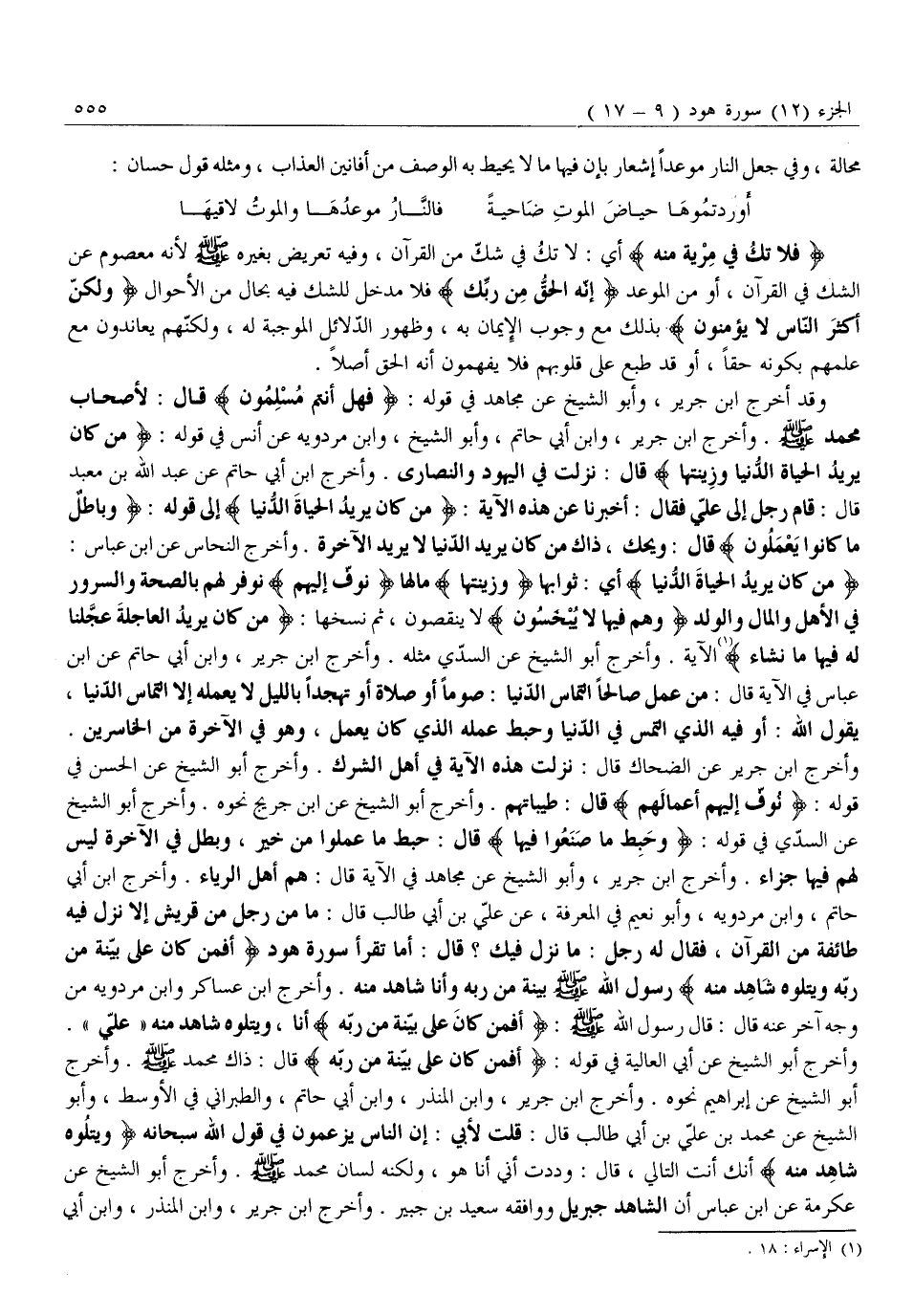 وَأَخْرَجَ أَبُو الشَّيْخِ عَنْ أَبِي الْعَالِيَةِ فِي قَوْلِهِ: أَفَمَنْ كانَ عَلى بَيِّنَةٍ مِنْ رَبِّهِ قَالَ: ذَاكَ محمد صلّى الله عليه وَسَلَّمَ. وَأَخْرَجَ أَبُو الشَّيْخِ عَنْ إِبْرَاهِيمَ نَحْوَهُ. وَأَخْرَجَ ابْنُ جَرِيرٍ، وَابْنُ الْمُنْذِرِ، وَابْنُ أَبِي حَاتِمٍ، وَالطَّبَرَانِيُّ فِي الْأَوْسَطِ، وَأَبُو الشَّيْخِ عَنْ مُحَمَّدِ بْنِ عَلِيِّ بْنِ أَبِي طَالِبٍ قَالَ: قُلْتُ لِأَبِي: إِنَّ النَّاسَ يَزْعُمُونَ فِي قَوْلِ اللَّهِ سُبْحَانَهُ وَيَتْلُوهُ شاهِدٌ مِنْهُ أَنَّكَ أَنْتَ التَّالِي، قَالَ: وَدِدْتُ أَنِّي أَنَا هُوَ، وَلَكِنَّهُ لسان محمد صلّى الله عليه وَسَلَّمَ. وَأَخْرَجَ أَبُو الشَّيْخِ عَنْ عِكْرِمَةَ عَنِ ابْنِ عَبَّاسٍ أَنَّ الشَّاهِدَ جِبْرِيلُ وَوَافَقَهُ سَعِيدِ بْنِ جُبَيْرٍ. وَأَخْرَجَ ابْنُ جَرِيرٍ، وَابْنُ الْمُنْذِرِ، وَابْنُ أَبِي