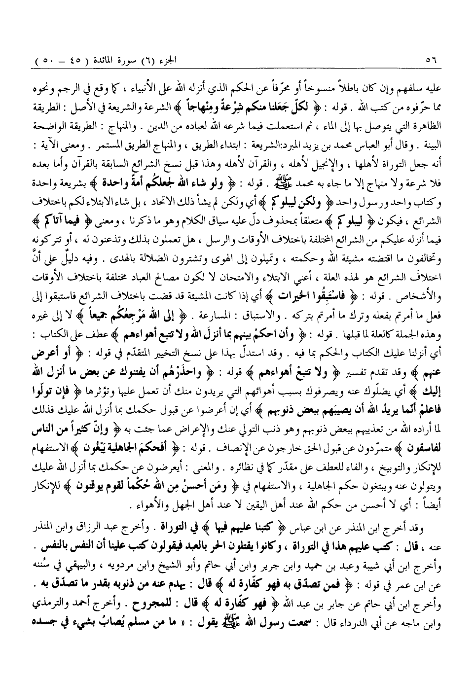 عَلَيْهِ سَلَفَهُمْ وَإِنْ كَانَ بَاطِلًا مَنْسُوخًا أَوْ مُحَرَّفًا عَنِ الْحُكْمِ الَّذِي أَنْزَلَهُ اللَّهُ عَلَى الْأَنْبِيَاءِ، كَمَا وَقَعَ فِي الرَّجْمِ وَنَحْوِهِ مِمَّا حَرَّفُوهُ مِنْ كُتُبِ اللَّهِ. قَوْلُهُ: لِكُلٍّ جَعَلْنا مِنْكُمْ شِرْعَةً وَمِنْهاجاً الشِّرْعَةُ وَالشَّرِيعَةُ فِي الْأَصْلِ: الطَّرِيقَةُ الظَّاهِرَةُ الَّتِي يُتَوَصَّلُ بِهَا إِلَى الْمَاءِ، ثُمَّ اسْتُعْمِلَتْ فِيمَا شَرَعَهُ اللَّهُ لِعِبَادِهِ مِنَ الدِّينِ. وَالْمِنْهَاجُ: الطَّرِيقَةُ الْوَاضِحَةُ الْبَيِّنَةُ. وَقَالَ أَبُو الْعَبَّاسِ مُحَمَّدُ بْنُ يَزِيدَ الْمُبَرِّدُ: الشَّرِيعَةُ: ابْتِدَاءُ الطَّرِيقِ، وَالْمِنْهَاجُ الطَّرِيقُ الْمُسْتَمِرُّ. وَمَعْنَى الْآيَةِ: