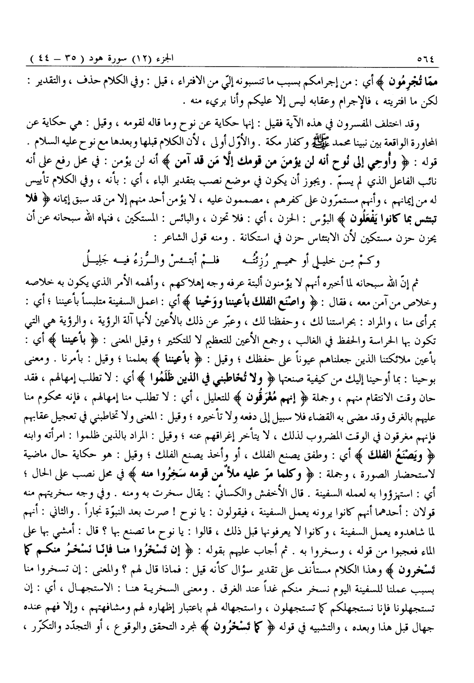 بِأَعْيُنِ مَلَائِكَتِنَا الَّذِينَ جَعَلْنَاهُمْ عُيُونًا عَلَى حِفْظِكَ وَقِيلَ: بِأَعْيُنِنا بِعِلْمِنَا وَقِيلَ: بِأَمْرِنَا. وَمَعْنَى بِوَحْيِنَا: بِمَا أَوْحَيْنَا إِلَيْكَ مِنْ كَيْفِيَّةِ صَنْعَتِهَا وَلا تُخاطِبْنِي فِي الَّذِينَ ظَلَمُوا أَيْ: لَا تَطْلُبُ إِمْهَالَهُمْ، فَقَدْ حَانَ وَقْتُ الِانْتِقَامِ مِنْهُمْ، وَجُمْلَةُ إِنَّهُمْ مُغْرَقُونَ لِلتَّعْلِيلِ، أَيْ: لَا تَطْلُبُ مِنَّا إِمْهَالَهُمْ، فَإِنَّهُ مَحْكُومٌ مِنَّا عَلَيْهِمْ بِالْغَرَقِ وَقَدْ مَضَى بِهِ الْقَضَاءُ فَلَا سَبِيلَ إِلَى دَفْعِهِ وَلَا تَأْخِيرِهِ وَقِيلَ: الْمَعْنَى وَلَا تُخَاطِبْنِي فِي تَعْجِيلِ عِقَابِهِمْ فَإِنَّهُمْ مُغْرَقُونَ فِي الْوَقْتِ الْمَضْرُوبِ لِذَلِكَ، لَا يَتَأَخَّرُ إِغْرَاقُهُمْ عَنْهُ وَقِيلَ: الْمُرَادُ بِالَّذِينِ ظَلَمُوا: امْرَأَتُهُ وَابْنُهُ وَيَصْنَعُ الْفُلْكَ أَيْ: وَطَفِقَ يَصْنَعُ الْفُلْكَ، أَوْ وَأَخَذَ يَصْنَعُ الْفُلْكَ وَقِيلَ: هُوَ حِكَايَةُ حَالٍ مَاضِيَةٍ لِاسْتِحْضَارِ الصُّورَةِ، وَجُمْلَةُ: وَكُلَّما مَرَّ عَلَيْهِ مَلَأٌ مِنْ قَوْمِهِ سَخِرُوا مِنْهُ فِي مَحَلِّ نَصْبٍ عَلَى الْحَالِ أَيْ: اسْتَهْزَءُوا بِهِ لِعَمَلِهِ السَّفِينَةَ. قَالَ الْأَخْفَشُ وَالْكِسَائِيُّ: يُقَالُ سَخِرَتْ بِهِ وَمِنْهُ. وَفِي وَجْهِ سُخْرِيَتِهِمْ مِنْهُ قَوْلَانِ: أَحَدُهُمَا أَنَّهُمْ كَانُوا يَرَوْنَهُ يَعْمَلُ السَّفِينَةَ، فَيَقُولُونَ: يَا نُوحُ! صِرْتَ بَعْدَ النُّبُوَّةِ نَجَّارًا. وَالثَّانِي: أَنَّهُمْ لَمَّا شَاهَدُوهُ يَعْمَلُ السَّفِينَةَ، وَكَانُوا لَا يَعْرِفُونَهَا قَبْلَ ذَلِكَ، قَالُوا: يا نوح ما تصنع بها؟ قَالَ: أَمْشِي بِهَا عَلَى الْمَاءِ فَعَجِبُوا مِنْ قَوْلِهِ، وَسَخِرُوا بِهِ. ثُمَّ أَجَابَ عَلَيْهِمْ بِقَوْلِهِ: إِنْ تَسْخَرُوا مِنَّا فَإِنَّا نَسْخَرُ مِنْكُمْ كَما تَسْخَرُونَ وَهَذَا الْكَلَامُ مُسْتَأْنَفٌ عَلَى تَقْدِيرِ سُؤَالٍ كَأَنَّهُ قِيلَ: فَمَاذَا قَالَ لَهُمْ؟ وَالْمَعْنَى: إِنْ تسخروا منا بسبب عملنا للسفينة اليوم نَسْخَرُ مِنْكُمْ غَدًا عِنْدَ الْغَرَقِ. وَمَعْنَى السُّخْرِيَةِ هُنَا: الِاسْتِجْهَالُ، أَيْ: إِنْ تَسْتَجْهِلُونَا فَإِنَّا نَسْتَجْهِلُكُمْ كَمَا تَسْتَجْهِلُونَ، وَاسْتِجْهَالُهُ لَهُمْ بِاعْتِبَارِ إِظْهَارِهِ لَهُمْ وَمُشَافَهَتِهِمْ، وَإِلَّا فَهُمْ عِنْدَهُ جُهَّالٌ قَبْلَ هَذَا وَبَعْدَهُ، وَالتَّشْبِيهُ فِي قَوْلِهِ كَما تَسْخَرُونَ لِمُجَرَّدِ التَّحَقُّقِ وَالْوُقُوعِ، أَوِ التَّجَدُّدِ وَالتَّكَرُّرِ،