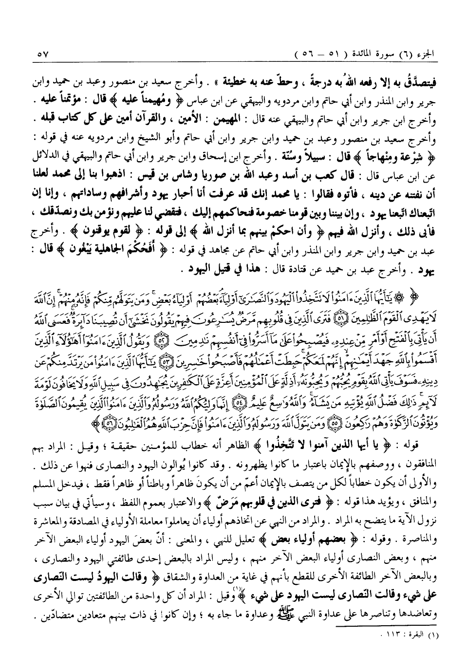 يا أَيُّهَا الَّذِينَ آمَنُوا لَا تَتَّخِذُوا الْيَهُودَ وَالنَّصارى أَوْلِياءَ بَعْضُهُمْ أَوْلِياءُ بَعْضٍ وَمَنْ يَتَوَلَّهُمْ مِنْكُمْ فَإِنَّهُ مِنْهُمْ إِنَّ اللَّهَ لَا يَهْدِي الْقَوْمَ الظَّالِمِينَ (51) فَتَرَى الَّذِينَ فِي قُلُوبِهِمْ مَرَضٌ يُسارِعُونَ فِيهِمْ يَقُولُونَ نَخْشى أَنْ تُصِيبَنا دائِرَةٌ فَعَسَى اللَّهُ أَنْ يَأْتِيَ بِالْفَتْحِ أَوْ أَمْرٍ مِنْ عِنْدِهِ فَيُصْبِحُوا عَلى مَا أَسَرُّوا فِي أَنْفُسِهِمْ نادِمِينَ (52) وَيَقُولُ الَّذِينَ آمَنُوا أَهؤُلاءِ الَّذِينَ أَقْسَمُوا بِاللَّهِ جَهْدَ أَيْمانِهِمْ إِنَّهُمْ لَمَعَكُمْ حَبِطَتْ أَعْمالُهُمْ فَأَصْبَحُوا خاسِرِينَ (53) يَا أَيُّهَا الَّذِينَ آمَنُوا مَنْ يَرْتَدَّ مِنْكُمْ عَنْ دِينِهِ فَسَوْفَ يَأْتِي اللَّهُ بِقَوْمٍ يُحِبُّهُمْ وَيُحِبُّونَهُ أَذِلَّةٍ عَلَى الْمُؤْمِنِينَ أَعِزَّةٍ عَلَى الْكافِرِينَ يُجاهِدُونَ فِي سَبِيلِ اللَّهِ وَلا يَخافُونَ لَوْمَةَ لائِمٍ ذلِكَ فَضْلُ اللَّهِ يُؤْتِيهِ مَنْ يَشاءُ وَاللَّهُ واسِعٌ عَلِيمٌ (54) إِنَّما وَلِيُّكُمُ اللَّهُ وَرَسُولُهُ وَالَّذِينَ آمَنُوا الَّذِينَ يُقِيمُونَ الصَّلاةَ وَيُؤْتُونَ الزَّكاةَ وَهُمْ راكِعُونَ (55)