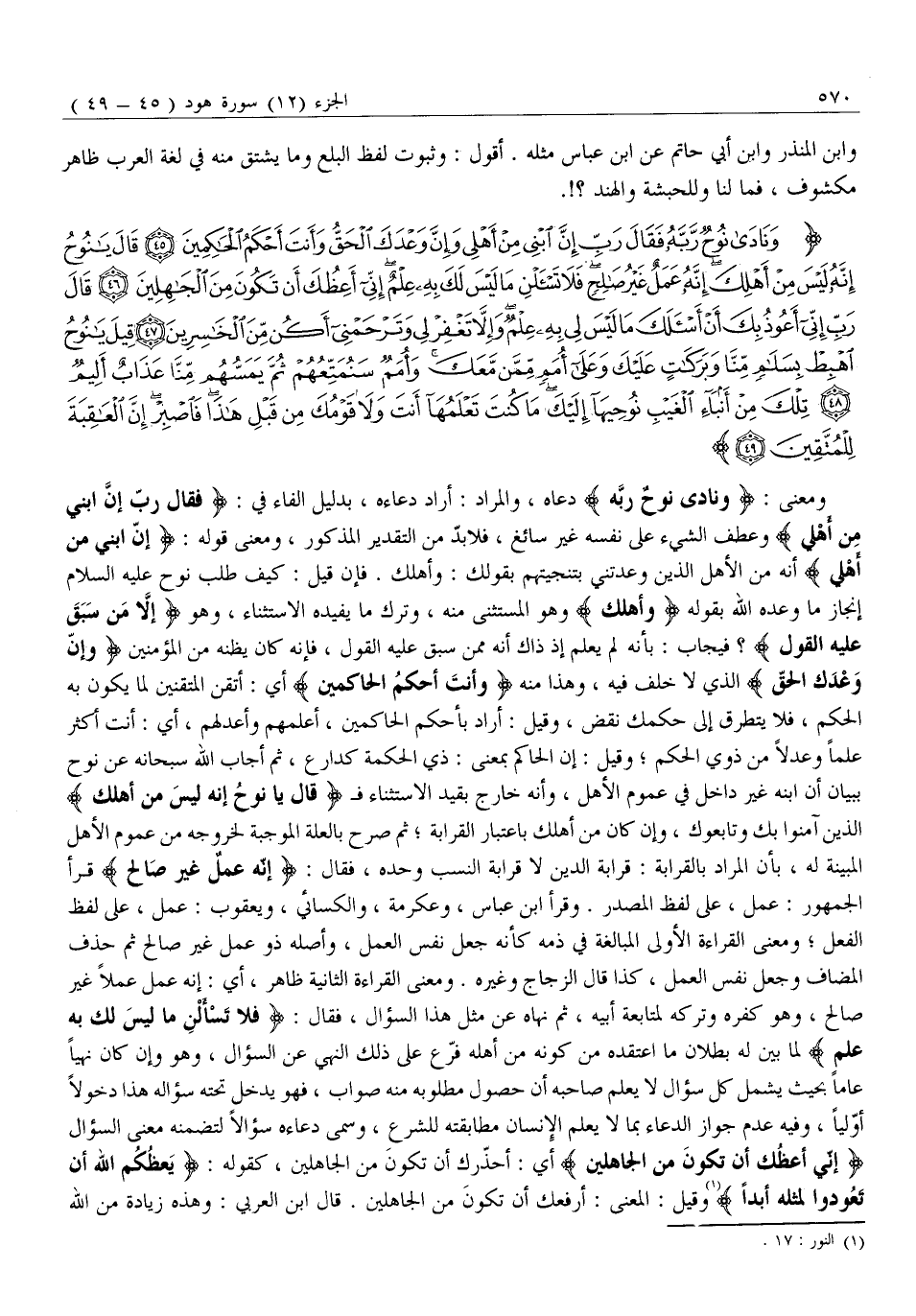 ومعنى: وَنادى نُوحٌ رَبَّهُ دَعَاهُ، وَالْمُرَادُ: أَرَادَ دُعَاءَهُ، بِدَلِيلِ الْفَاءِ فِي: فَقالَ رَبِّ إِنَّ ابْنِي مِنْ أَهْلِي وَعَطْفُ الشَّيْءِ عَلَى نَفْسِهِ غَيْرُ سَائِغٍ، فَلَا بُدَّ مِنَ التَّقْدِيرِ الْمَذْكُورِ، وَمَعْنَى قَوْلِهِ: إِنَّ ابْنِي مِنْ أَهْلِي أَنَّهُ مِنَ الْأَهْلِ الَّذِينَ وَعَدْتَنِي بِتَنْجِيَتِهِمْ بِقَوْلِكَ: وَأَهْلَكَ. فَإِنْ قِيلَ: كَيْفَ طَلَبَ نُوحٌ عَلَيْهِ السَّلَامُ إِنْجَازَ مَا وَعَدَهُ اللَّهُ بِقَوْلِهِ: وَأَهْلَكَ وَهُوَ الْمُسْتَثْنَى مِنْهُ، وَتَرَكَ مَا يُفِيدُهُ الِاسْتِثْنَاءُ، وَهُوَ إِلَّا مَنْ سَبَقَ عَلَيْهِ الْقَوْلُ؟ فَيُجَابُ: بِأَنَّهُ لَمْ يَعْلَمْ إِذْ ذَاكَ أَنَّهُ مِمَّنْ سَبَقَ عَلَيْهِ الْقَوْلُ، فَإِنَّهُ كَانَ يَظُنُّهُ مِنَ الْمُؤْمِنِينَ وَإِنَّ وَعْدَكَ الْحَقُّ الَّذِي لَا خُلْفَ فِيهِ، وَهَذَا مِنْهُ وَأَنْتَ أَحْكَمُ الْحاكِمِينَ أَيْ: أَتْقَنُ الْمُتْقِنِينَ لِمَا يَكُونُ بِهِ الْحُكْمُ، فَلَا يَتَطَرَّقُ إِلَى حُكْمِكَ نَقْضٌ، وَقِيلَ: أَرَادَ بِأَحْكَمِ الْحَاكِمِينَ، أَعْلَمَهُمْ وَأَعْدَلَهُمْ، أَيْ: أَنْتَ أَكْثَرُ عِلْمًا وَعَدْلًا مِنْ ذَوِي الْحُكْمِ وَقِيلَ: إِنَّ الْحَاكِمَ بِمَعْنَى: ذِي الْحِكْمَةِ كَدَارِعٍ، ثُمَّ أَجَابَ اللَّهُ سُبْحَانَهُ عَنْ نُوحٍ بِبَيَانِ أَنَّ ابْنَهُ غَيْرُ دَاخِلٍ فِي عُمُومِ الْأَهْلِ، وَأَنَّهُ خَارِجٌ بِقَيْدِ الِاسْتِثْنَاءِ فِ قالَ يَا نُوحُ إِنَّهُ لَيْسَ مِنْ أَهْلِكَ الَّذِينَ آمَنُوا بِكَ وَتَابَعُوكَ، وَإِنْ كَانَ مِنْ أَهْلِكَ بِاعْتِبَارِ الْقَرَابَةِ ثُمَّ صَرَّحَ بِالْعِلَّةِ الْمُوجِبَةِ لِخُرُوجِهِ مِنْ عُمُومِ الْأَهْلِ الْمُبَيِّنَةِ لَهُ، بِأَنَّ الْمُرَادَ بِالْقَرَابَةِ: قَرَابَةُ الدِّينِ لَا قَرَابَةُ النَّسَبِ وَحْدَهُ، فَقَالَ: إِنَّهُ عَمَلٌ غَيْرُ صالِحٍ قَرَأَ الْجُمْهُورُ: عَمَلٌ، عَلَى لَفْظِ الْمَصْدَرِ. وَقَرَأَ ابْنُ عَبَّاسٍ، وَعِكْرِمَةُ، وَالْكِسَائِيُّ، وَيَعْقُوبُ: عَمِلَ، عَلَى لَفْظِ الْفِعْلِ وَمَعْنَى الْقِرَاءَةِ الْأُولَى الْمُبَالَغَةُ فِي ذَمِّهِ كَأَنَّهُ جُعِلَ نَفْسَ الْعَمَلِ، وَأَصْلُهُ ذُو عَمَلٍ غَيْرِ صَالِحٍ ثُمَّ حَذَفَ الْمُضَافَ وَجُعِلَ نَفْسَ الْعَمَلِ، كَذَا قَالَ الزَّجَّاجُ وَغَيْرُهُ. وَمَعْنَى الْقِرَاءَةِ الثَّانِيَةِ ظَاهِرٌ، أَيْ: إِنَّهُ عَمِلَ عَمَلًا غَيْرَ صَالِحٍ، وَهُوَ كُفْرُهُ وَتَرْكُهُ لِمُتَابَعَةِ أَبِيهِ، ثُمَّ نَهَاهُ عَنْ مِثْلِ هَذَا السُّؤَالِ، فَقَالَ: فَلا تَسْئَلْنِ مَا لَيْسَ لَكَ بِهِ عِلْمٌ لَمَّا بَيَّنَ لَهُ بُطْلَانَ مَا اعْتَقَدَهُ مِنْ كَوْنِهِ مِنْ أَهْلِهِ فَرَّعَ عَلَى ذَلِكَ النَّهْيَ عَنِ السُّؤَالِ، وَهُوَ وَإِنْ كَانَ نَهْيًا عَامَّا بِحَيْثُ يَشْمَلُ كُلَّ سُؤَالٍ لَا يَعْلَمُ صَاحِبُهُ أَنَّ حُصُولَ مَطْلُوبِهِ مِنْهُ صَوَابٌ، فَهُوَ يَدْخُلُ تَحْتَهُ سُؤَالُهُ هَذَا دُخُولًا أَوَّلِيًّا، وَفِيهِ عَدَمُ جَوَازِ الدُّعَاءِ بِمَا لَا يَعْلَمُ الْإِنْسَانُ مُطَابَقَتَهُ لِلشَّرْعِ، وَسُمِّيَ دُعَاءُهُ سُؤَالًا لِتَضَمُّنِهِ مَعْنَى السُّؤَالِ إِنِّي أَعِظُكَ أَنْ تَكُونَ مِنَ الْجاهِلِينَ أَيْ: أُحَذِّرُكَ أَنْ تَكُونَ مِنَ الْجَاهِلِينَ، كَقَوْلِهِ: يَعِظُكُمُ اللَّهُ أَنْ تَعُودُوا لِمِثْلِهِ أَبَداً «1» وَقِيلَ: الْمَعْنَى: أَرْفَعُكَ أَنْ تَكُونَ مِنَ الْجَاهِلِينَ. قَالَ ابْنُ الْعَرَبِيِّ: وَهَذِهِ زِيَادَةٌ مِنَ اللَّهِ