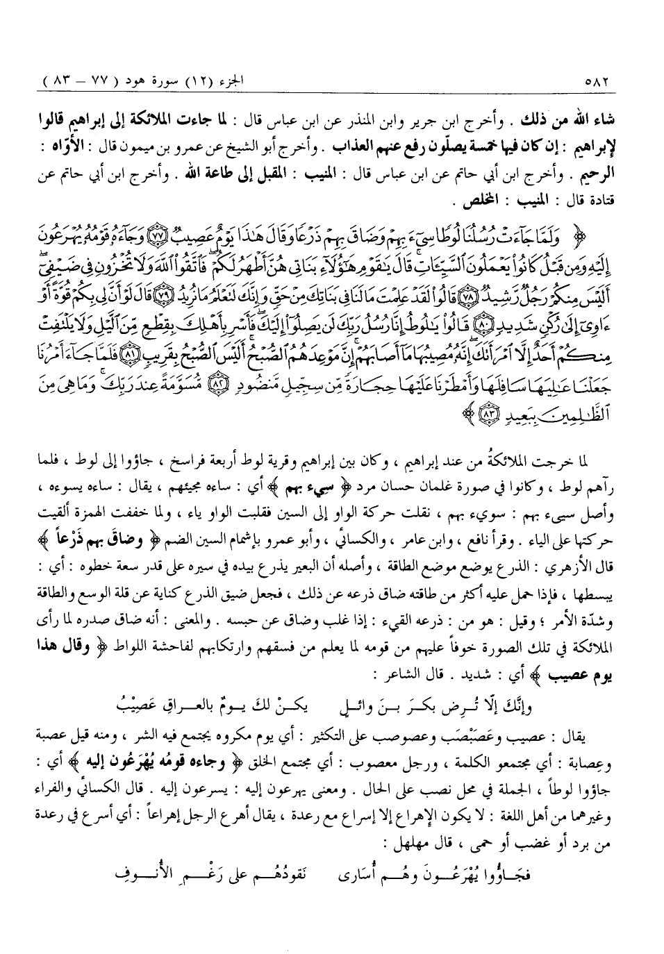 لَمَّا خَرَجَتِ الْمَلَائِكَةُ مِنْ عِنْدِ إِبْرَاهِيمَ، وَكَانَ بَيْنَ إِبْرَاهِيمَ وَقَرْيَةِ لُوطٍ أَرْبَعَةُ فَرَاسِخَ، جَاءُوا إِلَى لُوطٍ، فَلَمَّا رَآهُمْ لُوطٌ، وَكَانُوا فِي صُورَةِ غِلْمَانٍ حِسَانٍ مُرْدٍ سِيءَ بِهِمْ أَيْ: سَاءَهُ مَجِيئُهُمْ، يُقَالُ: سَاءَهُ يسوءه، وأصل سيئ بِهِمْ: سُوِئَ بِهِمْ، نُقِلَتْ حَرَكَةُ الْوَاوِ إِلَى السِّينِ فَقُلِبَتِ الْوَاوُ يَاءً، وَلَمَّا خُفِّفَتِ الْهَمْزَةُ أُلْقِيَتْ حَرَكَتُهَا عَلَى الْيَاءِ. وَقَرَأَ نَافِعٌ، وَابْنُ عَامِرٍ، وَالْكِسَائِيُّ، وَأَبُو عَمْرٍو بِإِشْمَامِ السِّينِ الضَّمَّ وَضاقَ بِهِمْ ذَرْعاً قَالَ الْأَزْهَرِيُّ: الذَّرْعُ يُوضَعُ مَوْضِعَ الطَّاقَةِ، وَأَصْلُهُ أَنَّ الْبَعِيرَ يَذْرَعُ بِيَدِهِ فِي سَيْرِهِ عَلَى قَدْرِ سِعَةِ خَطْوِهِ: أَيْ: