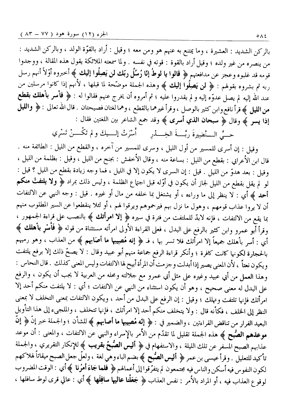 وَهَذَا الْعَمَلُ مِنْ أَبِي عُبَيْدٍ وَغَيْرِهِ عَلَى مِثْلِ أَبِي عَمْرٍو مَعَ جَلَالَتِهِ وَمَحَلِّهِ مِنَ الْعَرَبِيَّةِ لَا يَجِبُ أَنْ يَكُونَ، وَالرَّفْعُ عَلَى الْبَدَلِ لَهُ مَعْنًى صَحِيحٌ، وَهُوَ أَنْ يَكُونَ اسْتِثْنَاءً مِنَ النَّهْيِ عَنِ الِالْتِفَاتِ أَيْ: لَا يَلْتَفِتْ مِنْكُمْ أَحَدٌ إِلَّا امْرَأَتُكَ فَإِنَّهَا تَلْتَفِتُ وَتَهْلَكُ وَقِيلَ: إِنَّ الرَّفْعَ عَلَى الْبَدَلِ مِنْ أَحَدٌ، وَيَكُونُ الِالْتِفَاتُ بِمَعْنَى التَّخَلُّفِ لَا بِمَعْنَى النَّظَرِ إِلَى الْخَلْفِ، فَكَأَنَّهُ قَالَ: وَلَا يَتَخَلَّفْ مِنْكُمْ أَحَدٌ إِلَّا امْرَأَتُكَ، فَإِنَّهَا تَتَخَلَّفُ، وَالْمُلْجِئُ إِلَى هَذَا التَّأْوِيلِ الْبَعِيدِ الْفِرَارُ مِنْ تُنَاقِضِ الْقِرَاءَتَيْنِ، وَالضَّمِيرُ فِي: إِنَّهُ مُصِيبُها مَا أَصابَهُمْ لِلشَّأْنِ وَالْجُمْلَةُ خَبَرُ إِنَّ إِنَّ مَوْعِدَهُمُ الصُّبْحُ هَذِهِ الْجُمْلَةُ تَقْلِيلٌ لِمَا تَقَدَّمَ مِنَ الْأَمْرِ بِالْإِسْرَاءِ وَالنَّهْيِ عَنِ الِالْتِفَاتِ، وَالْمَعْنَى: أَنَّ مَوْعِدَ عَذَابِهِمُ الصُّبْحُ الْمُسْفِرُ عَنْ تِلْكَ اللَّيْلَةِ، وَالِاسْتِفْهَامُ فِي أَلَيْسَ الصُّبْحُ بِقَرِيبٍ لِلْإِنْكَارِ التَّقْرِيرِيِّ، وَالْجُمْلَةُ تَأْكِيدٌ لِلتَّعْلِيلِ. وَقَرَأَ عِيسَى بْنُ عُمَرَ أَلَيْسَ الصُّبْحُ بِضَمِّ الْبَاءِ وَهِيَ لُغَةٌ، وَلَعَلَّ جَعْلَ الصُّبْحِ مِيقَاتًا لِهَلَاكِهِمْ لِكَوْنِ النُّفُوسِ فِيهِ أَسْكَنَ وَالنَّاسُ فِيهِ مُجْتَمِعُونَ لَمْ يَتَفَرَّقُوا إِلَى أَعْمَالِهِمْ فَلَمَّا جاءَ أَمْرُنا أَيْ: الْوَقْتُ الْمَضْرُوبُ لِوُقُوعِ الْعَذَابِ فِيهِ، أَوِ الْمُرَادُ بِالْأَمْرِ: نَفْسُ الْعَذَابِ جَعَلْنا عالِيَها سافِلَها أَيْ: عَالِيَ قُرَى لوط سافلها،