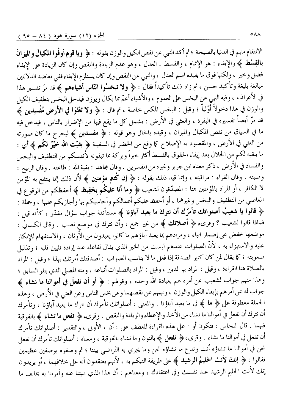 الِانْتِقَامِ مِنْهُمْ فِي الدُّنْيَا بِالصَّيْحَةِ ثُمَّ أَكَّدَ النَّهْيَ عَنْ نَقْصِ الْكَيْلِ وَالْوَزْنِ بِقَوْلِهِ: وَيا قَوْمِ أَوْفُوا الْمِكْيالَ وَالْمِيزانَ بِالْقِسْطِ وَالْإِيفَاءُ: هُوَ الْإِتْمَامُ، وَالْقِسْطُ: الْعَدْلُ، وَهُوَ عَدَمُ الزِّيَادَةِ وَالنَّقْصِ وَإِنْ كَانَ الزِّيَادَةُ عَلَى الْإِيفَاءِ فَضْلٌ وَخَيْرٌ، وَلَكِنَّهَا فَوْقَ مَا يُفِيدُهُ اسْمُ الْعَدْلِ، وَالنَّهْيُ عَنِ النَّقْصِ وَإِنْ كَانَ يَسْتَلْزِمُ الْإِيفَاءَ فَفِي تَعَاضُدِ الدَّلَالَتَيْنِ مُبَالَغَةٌ بَلِيغَةٌ وَتَأْكِيدٌ حَسَنٌ، ثُمَّ زَادَ ذَلِكَ تَأْكِيدًا فَقَالَ: وَلا تَبْخَسُوا النَّاسَ أَشْياءَهُمْ قَدْ مَرَّ تَفْسِيرُ هَذَا فِي الْأَعْرَافِ، وَفِيهِ النَّهْيُ عَنِ الْبَخْسِ عَلَى الْعُمُومِ، وَالْأَشْيَاءُ أَعَمُّ مِمَّا يُكَالُ وَيُوزَنُ فَيَدْخُلُ الْبَخْسُ بِتَطْفِيفِ الْكَيْلِ وَالْوَزْنِ فِي هَذَا دُخُولًا أَوَّلِيًّا وَقِيلَ: الْبَخْسُ الْمَكْسُ خَاصَّةً، ثُمَّ قَالَ: وَلا تَعْثَوْا فِي الْأَرْضِ مُفْسِدِينَ قَدْ مَرَّ أَيْضًا تَفْسِيرُهُ فِي الْبَقَرَةِ، وَالْعُثِيُّ فِي الْأَرْضِ: يَشْمَلُ كُلَّ مَا يَقَعُ فِيهَا مِنَ الْإِضْرَارِ بِالنَّاسِ، فَيَدْخُلُ فِيهِ مَا فِي السِّيَاقِ مِنْ نَقْصِ الْمِكْيَالِ وَالْمِيزَانِ وَقَيَّدَهُ بِالْحَالِ وَهُوَ قَوْلُهُ: مُفْسِدِينَ لِيُخْرِجَ مَا كَانَ صُورَتُهُ مِنَ الْعُثِيِّ فِي الْأَرْضِ، وَالْمَقْصُودُ بِهِ الْإِصْلَاحُ كَمَا وَقَعَ مِنَ الْخَضِرِ في السفينة بَقِيَّتُ اللَّهِ خَيْرٌ لَكُمْ أَيْ:
