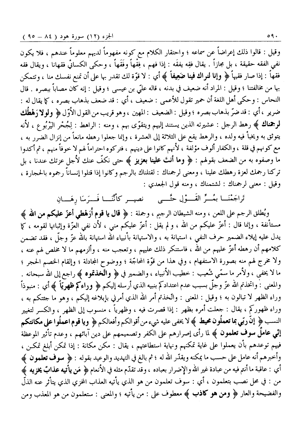 وَقِيلَ: قَالُوا ذَلِكَ إِعْرَاضًا عَنْ سَمَاعِهِ وَاحْتِقَارَ الْكَلَامِ مَعَ كَوْنِهِ مَفْهُومًا لَدَيْهِمْ مَعْلُومًا عِنْدَهُمْ، فَلَا يَكُونُ نَفْيُ الْفِقْهِ حَقِيقَةً، بَلْ مَجَازًا. يُقَالُ فَقِهَ يَفْقَهُ: إِذَا فَهِمَ، فِقْهًا وَفَقَهًا، وَحَكَى الْكِسَائِيُّ فُقْهَانًا، وَيُقَالُ فَقُهَ فِقْهًا: إِذَا صَارَ فَقِيهًا وَإِنَّا لَنَراكَ فِينا ضَعِيفاً أَيْ: لَا قُوَّةَ لَكَ تَقْدِرُ بِهَا عَلَى أَنْ تَمْنَعَ نَفْسَكَ مِنَّا، وَتَتَمَكَّنَ بِهَا مِنْ مُخَالَفَتِنَا وَقِيلَ: الْمُرَادُ أَنَّهُ ضَعِيفٌ فِي بَدَنِهِ، قَالَهُ عَلِيُّ بْنُ عِيسَى وَقِيلَ: إِنَّهُ كَانَ مُصَابًا بِبَصَرِهِ. قَالَ النَّحَّاسُ: وَحَكَى أَهْلُ اللُّغَةِ أَنَّ حِمْيَرَ تَقُولُ لِلْأَعْمَى: ضَعِيفٌ، أَيْ: قَدْ ضَعُفَ بِذَهَابِ بَصَرِهِ، كَمَا يُقَالُ لَهُ:
