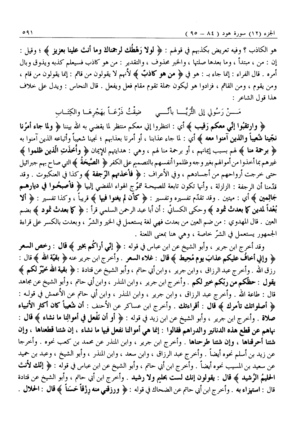 وَارْتَقِبُوا إِنِّي مَعَكُمْ رَقِيبٌ أَيِ: انْتَظَرُوا إِنِّي مَعَكُمْ مُنْتَظِرٌ لِمَا يَقْضِي بِهِ اللَّهُ بَيْنَنَا وَلَمَّا جاءَ أَمْرُنا نَجَّيْنا شُعَيْباً وَالَّذِينَ آمَنُوا مَعَهُ أَيْ: لَمَّا جَاءَ عَذَابُنَا، أَوْ أَمَرُنَا بِعَذَابِهِمْ نَجَّيْنَا شُعَيْبًا وَأَتْبَاعَهُ الَّذِينَ آمَنُوا بِهِ بِرَحْمَةٍ مِنَّا لَهُمْ بِسَبَبِ إِيمَانِهِمْ، أَوْ بِرَحْمَةٍ مِنَّا لَهُمْ، وَهِيَ: هِدَايَتُهُمْ لِلْإِيمَانِ وَأَخَذَتِ الَّذِينَ ظَلَمُوا غَيْرَهُمْ بِمَا أَخَذُوا مِنْ أَمْوَالِهِمْ بِغَيْرِ وَجْهٍ وَظَلَمُوا أَنْفُسَهُمْ بِالتَّصْمِيمِ عَلَى الْكُفْرِ الصَّيْحَةُ الَّتِي صَاحَ بِهِمْ جِبْرَائِيلُ حَتَّى خَرَجَتْ أَرْوَاحُهُمْ مِنْ أَجْسَادِهِمْ، وَفِي الأعراف: فَأَخَذَتْهُمُ الرَّجْفَةُ وَكَذَا فِي الْعَنْكَبُوتِ. وَقَدْ قَدَّمْنَا أَنَّ الرَّجْفَةَ: الزَّلْزَلَةُ، وَأَنَّهَا تَكُونُ تَابِعَةً لِلصَّيْحَةِ لِتَمَوُّجِ الْهَوَاءِ الْمُفْضِي إِلَيْهَا فَأَصْبَحُوا فِي دِيارِهِمْ جاثِمِينَ أَيْ: مَيِّتِينَ. وَقَدْ تَقَدَّمَ تَفْسِيرُهُ وَتَفْسِيرُ: كَأَنْ لَمْ يَغْنَوْا فِيها قَرِيبًا، وَكَذَا تَفْسِيرُ: أَلا بُعْداً لِمَدْيَنَ كَما بَعِدَتْ ثَمُودُ وَحَكَى الْكِسَائِيُّ: أَنَّ أَبَا عَبْدِ الرَّحْمَنِ السُّلَمِيَّ قَرَأَ: كَمَا بَعُدَتْ ثَمُودُ بِضَمِّ الْعَيْنِ. قَالَ الَمَهَدَوِيُّ: مَنْ ضَمَّ الْعَيْنَ مِنْ بَعُدَتْ فَهِيَ لُغَةٌ يُسْتَعْمَلُ فِي الْخَيْرِ وَالشَّرِّ، وَبَعِدَتْ بِالْكَسْرِ عَلَى قِرَاءَةِ الْجُمْهُورِ يُسْتَعْمَلُ فِي الشَّرِّ خَاصَّةً، وَهِيَ هُنَا بِمَعْنَى اللَّعْنَةِ.