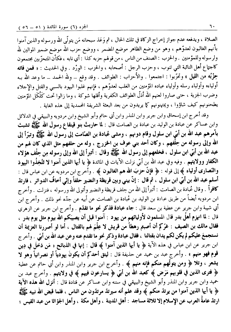 أَسْلَمَ عَبْدُ اللَّهِ بْنُ أبيّ ابن سَلُولٍ، ثُمَّ قَالَ: إِنَّ بَيْنِي وَبَيْنَ قُرَيْظَةَ وَالنَّضِيرِ حِلْفًا وَإِنِّي أَخَافُ الدَّوَائِرَ، فَارْتَدَّ كَافِرًا. وَقَالَ عُبَادَةُ بْنُ الصَّامِتِ: أَتَبَرَّأُ إِلَى اللَّهِ مِنْ حِلْفِ قُرَيْظَةَ وَالنَّضِيرِ وَأَتَوَلَّى اللَّهَ وَرَسُولَهُ، فَنَزَلَتْ. وَأَخْرَجَ ابْنُ مَرْدَوَيْهِ أَيْضًا مِنْ طَرِيقِ عبادة بن الوليد بن عبادة بن الصامت عَنْ أَبِيهِ عَنْ جَدِّهِ نَحْوَ ذَلِكَ. وَأَخْرَجَ ابْنُ أَبِي شَيْبَةَ وَابْنُ جَرِيرٍ عَنْ عَطِيَّةَ بْنِ سَعْدٍ قَالَ: جَاءَ عُبَادَةُ فَذَكَرَ نَحْوَ مَا تَقَدَّمَ. وَأَخْرَجَ ابْنُ جَرِيرٍ عَنِ الزُّهْرِيِّ قَالَ: لَمَّا انْهَزَمَ أَهْلُ بَدْرٍ قَالَ الْمُسْلِمُونَ لِأَوْلِيَائِهِمْ مِنْ يَهُودَ: آمِنُوا قَبْلَ أَنْ يُصِيبَكُمُ اللَّهُ بِيَوْمٍ مِثْلِ يَوْمِ بَدْرٍ، فَقَالَ مَالِكُ بْنُ الصَّيْفِ: غَرَّكُمْ أَنْ أَصَبْتُمْ رَهْطًا مِنْ قُرَيْشٍ لَا عِلْمَ لَهُمْ بِالْقِتَالِ، أَمَّا لَوْ أَصْرَرْنَا الْعَزِيمَةَ أَنْ نَسْتَجْمِعَ عَلَيْكُمْ لَمْ يَكُنْ لَكُمْ يَدَانُ بِقِتَالِنَا، فَقَالَ عُبَادَةُ وَذَكَرَ نَحْوَ مَا تَقَدَّمَ عَنْهُ وَعَنْ عَبْدِ اللَّهِ بْنِ أُبَيٍّ. وَأَخْرَجَ ابْنُ جَرِيرٍ عَنِ ابْنِ عَبَّاسٍ فِي هذه الآية يا أَيُّهَا الَّذِينَ آمَنُوا قَالَ: إِنَّهَا فِي الذَّبَائِحِ «مَنْ دَخَلَ فِي دِينِ قَوْمٍ فَهُوَ مِنْهُمْ» . وَأَخْرَجَ عَبْدُ بْنُ حُمَيْدٍ عَنْ حُذَيْفَةَ قَالَ: لِيَتَّقِ أَحَدُكُمْ أَنْ يَكُونَ يَهُودِيًّا أَوْ نَصْرَانِيًّا وَهُوَ لَا يَشْعُرُ، وَتَلَا وَمَنْ يَتَوَلَّهُمْ مِنْكُمْ فَإِنَّهُ مِنْهُمْ. وَأَخْرَجَ ابْنُ جَرِيرٍ وَابْنُ الْمُنْذِرِ وَابْنُ أَبِي حَاتِمٍ عَنْ عَطِيَّةَ فَتَرَى الَّذِينَ فِي قُلُوبِهِمْ مَرَضٌ كَعَبْدِ اللَّهِ بْنِ أُبَيٍّ يُسارِعُونَ فِيهِمْ فِي وِلَايَتِهِمْ. وَأَخْرَجَ عَبْدُ بْنُ حُمَيْدٍ وَابْنُ جَرِيرٍ وَابْنُ الْمُنْذِرِ وَأَبُو الشَّيْخِ وَالْبَيْهَقِيُّ فِي سُنَنِهِ وَابْنُ عَسَاكِرَ عَنْ قَتَادَةَ قَالَ: أنزل الله هذه الآية يَا أَيُّهَا الَّذِينَ آمَنُوا مَنْ يَرْتَدَّ مِنْكُمْ وَقَدْ عَلِمَ أَنَّهُ سَيَرْتَدُّ مُرْتَدُّونَ مِنَ النَّاسِ، فَلَمَّا قَبَضَ اللَّهُ نَبِيَّهُ صَلَّى اللَّهُ عَلَيْهِ وَسَلَّمَ ارْتَدَّ عَامَّةُ الْعَرَبِ عَنِ الْإِسْلَامِ إِلَّا ثَلَاثَةَ مَسَاجِدَ: أَهْلُ الْمَدِينَةِ، وَأَهْلُ مَكَّةَ، وَأَهْلُ الجؤاثا مِنْ عَبْدِ الْقَيْسِ