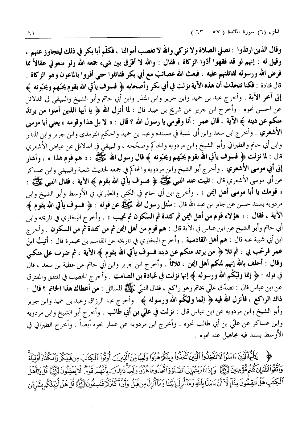 «قَوْمُكَ يَا أَبَا مُوسَى أَهْلُ الْيَمَنِ» . وَأَخْرَجَ ابْنُ أَبِي حَاتِمٍ فِي الْكُنَى وَالطَّبَرَانِيُّ فِي الْأَوْسَطِ وَأَبُو الشَّيْخِ وَابْنُ مَرْدَوَيْهِ بِسَنَدٍ حَسَنٍ عَنْ جَابِرِ بْنِ عَبْدِ اللَّهِ قَالَ: سُئِلَ رَسُولُ اللَّهِ صَلَّى اللَّهُ عَلَيْهِ وَسَلَّمَ عَنْ قَوْلِهِ: فَسَوْفَ يَأْتِي اللَّهُ بِقَوْمٍ الْآيَةَ، فَقَالَ: «هَؤُلَاءِ قَوْمٌ مِنْ أَهْلِ الْيَمَنِ ثم كندة ثم السّكون ثم تحبيب» . وَأَخْرَجَ الْبُخَارِيُّ فِي تَارِيخِهِ وَابْنُ أَبِي حَاتِمٍ وَأَبُو الشَّيْخِ عَنِ ابْنِ عَبَّاسٍ فِي الْآيَةِ قَالَ: هُمْ قَوْمٌ مِنْ أَهْلِ الْيَمَنِ ثُمَّ مِنْ كِنْدَةَ ثُمَّ مِنَ السَّكُونِ. وَأَخْرَجَ ابْنُ أَبِي شَيْبَةَ عَنْهُ قَالَ: هُمْ أَهْلُ الْقَادِسِيَّةِ. وَأَخْرَجَ الْبُخَارِيُّ فِي تَارِيخِهِ عَنِ الْقَاسِمِ بْنِ مُخَيْمِرَةَ قَالَ: أَتَيْتُ ابْنَ عُمَرَ فَرَحَّبَ بِي، ثُمَّ تَلَا مَنْ يَرْتَدَّ مِنْكُمْ عَنْ دِينِهِ فَسَوْفَ يَأْتِي اللَّهُ بِقَوْمٍ الْآيَةَ، ثُمَّ ضَرَبَ عَلَى مَنْكِبَيْ وَقَالَ: أَحْلِفُ بِاللَّهِ إِنَّهُمْ لَمِنْكُمْ أَهْلَ الْيَمَنِ، ثَلَاثًا. وَأَخْرَجَ ابْنُ جَرِيرٍ وَابْنُ أَبِي حَاتِمٍ عَنْ عَطِيَّةَ بْنِ سَعْدٍ، قَالَ فِي قَوْلِهِ: إِنَّما وَلِيُّكُمُ اللَّهُ وَرَسُولُهُ إِنَّهَا نَزَلَتْ فِي عُبَادَةَ بْنِ الصَّامِتِ. وَأَخْرَجَ الْخَطِيبُ فِي الْمُتَّفَقِ وَالْمُفْتَرَقِ عَنِ ابْنِ عَبَّاسٍ قَالَ: تَصَدَّقَ عَلِيٌّ بِخَاتَمٍ وَهُوَ رَاكِعٌ، فَقَالَ النَّبِيُّ صلّى الله عليه وَسَلَّمَ لِلسَّائِلِ: مَنْ أَعْطَاكَ هَذَا الْخَاتَمَ؟ قَالَ: