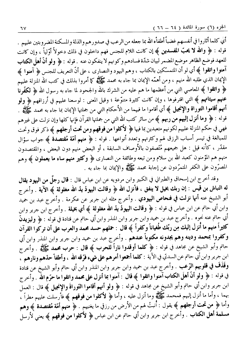 وَقَدْ أَخْرَجَ ابْنُ إِسْحَاقَ وَالطَّبَرَانِيُّ فِي الْكَبِيرِ وَابْنُ مَرْدَوَيْهِ عَنِ ابْنِ عَبَّاسٍ قَالَ: قَالَ رَجُلٌ مِنَ الْيَهُودِ يُقَالُ لَهُ النَّبَّاشُ بْنُ قَيْسٍ: إِنَّ رَبَّكَ بَخِيلٌ لَا يُنْفِقُ، فَأَنْزَلَ اللَّهُ وَقالَتِ الْيَهُودُ يَدُ اللَّهِ مَغْلُولَةٌ الْآيَةَ. وَأَخْرَجَ أَبُو الشَّيْخِ عَنْهُ أَنَّهَا نَزَلَتْ فِي فِنْحَاصَ الْيَهُودِيِّ. وَأَخْرَجَ مِثْلَهُ ابْنُ جَرِيرٍ عَنْ عِكْرِمَةَ. وَأَخْرَجَ عَبْدُ بْنُ حُمَيْدٍ وَابْنُ أَبِي حَاتِمٍ عن ابْنِ عَبَّاسٍ فِي قَوْلِهِ: وَقالَتِ الْيَهُودُ يَدُ اللَّهِ مَغْلُولَةٌ أَيْ بَخِيلَةٌ. وَأَخْرَجَ ابْنُ جَرِيرٍ وَابْنُ أَبِي حَاتِمٍ عَنْهُ نَحْوَهُ. وَأَخْرَجَ عَبْدُ بْنُ حُمَيْدٍ وَابْنُ جَرِيرٍ وَابْنُ الْمُنْذِرِ وَابْنُ أَبِي حَاتِمٍ عَنْ قَتَادَةَ فِي قَوْلِهِ: وَلَيَزِيدَنَّ كَثِيراً مِنْهُمْ مَا أُنْزِلَ إِلَيْكَ مِنْ رَبِّكَ طُغْياناً وَكُفْراً قَالَ: حَمَلَهُمْ حَسَدُ مُحَمَّدٍ وَالْعَرَبِ عَلَى أَنْ تَرَكُوا الْقُرْآنَ وَكَفَرُوا بِمُحَمَّدٍ وَدِينِهِ وَهُمْ يَجِدُونَهُ مَكْتُوبًا عِنْدَهُمْ. وَأَخْرَجَ عَبْدُ بْنُ حُمَيْدٍ وَابْنُ جَرِيرٍ وَابْنُ المنذر وابن أبي حَاتِمٍ وَأَبُو الشَّيْخِ عَنْ مُجَاهِدٍ فِي قَوْلِهِ: كُلَّما أَوْقَدُوا نَارًا لِلْحَرْبِ قَالَ: حَرْبُ مُحَمَّدٍ صَلَّى اللَّهُ عَلَيْهِ وَسَلَّمَ. وَأَخْرَجَ ابْنُ جَرِيرٍ وَابْنُ أَبِي حَاتِمٍ عَنِ السُّدِّيِّ فِي الْآيَةِ: كُلَّمَا أَجْمَعُوا أَمْرَهُمْ عَلَى شَيْءٍ فَرَّقَهُ اللَّهُ، وَأَطْفَأَ حَدَّهُمْ وَنَارَهُمْ، وَقَذَفَ فِي قُلُوبِهِمُ الرُّعْبَ. وَأَخْرَجَ عَبْدُ بْنُ حُمَيْدٍ وَابْنُ جَرِيرٍ وَابْنُ المنذر وابن أبي حَاتِمٍ وَأَبُو الشَّيْخِ عَنْ قَتَادَةَ فِي قَوْلِهِ: وَلَوْ أَنَّ أَهْلَ الْكِتابِ آمَنُوا وَاتَّقَوْا قَالَ: آمَنُوا بِمَا أُنْزِلَ عَلَى مُحَمَّدٍ وَاتَّقَوْا مَا حَرَّمَ اللَّهِ. وَأَخْرَجَ ابْنُ جَرِيرٍ وَابْنُ أَبِي حَاتِمٍ وَأَبُو الشَّيْخِ عَنْ مُجَاهِدٍ فِي قَوْلِهِ: وَلَوْ أَنَّهُمْ أَقامُوا التَّوْراةَ وَالْإِنْجِيلَ قَالَ: الْعَمَلَ بِهِمَا، وَأَمَّا مَا أُنْزِلَ إِلَيْهِمْ فَمُحَمَّدٌ صَلَّى اللَّهُ عَلَيْهِ وَسَلَّمَ وَمَا أُنْزِلَ عَلَيْهِ، وَأَمَّا لَأَكَلُوا مِنْ فَوْقِهِمْ فَأَرْسَلْتُ عَلَيْهِمْ مَطَرًا، وَأَمَّا مِنْ تَحْتِ أَرْجُلِهِمْ يَقُولُ: أُنْبِتُ لَهُمْ مِنَ الْأَرْضِ مِنْ رِزْقِي مَا يُغْنِيهِمْ. مِنْهُمْ أُمَّةٌ مُقْتَصِدَةٌ وَهُمْ مَسْلَمَةُ أَهْلِ الْكِتَابِ. وَأَخْرَجَ ابْنُ جَرِيرٍ وَابْنُ أَبِي حَاتِمٍ عَنِ ابْنِ عَبَّاسٍ لَأَكَلُوا مِنْ فَوْقِهِمْ يَعْنِي لَأُرْسِلُ
