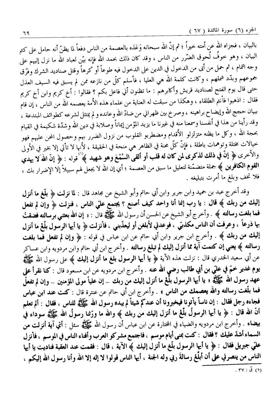 وَقَدْ أَخْرَجَ عَبْدُ بْنُ حُمَيْدٍ وَابْنُ جَرِيرٍ وَابْنُ أَبِي حَاتِمٍ وَأَبُو الشَّيْخِ عَنْ مُجَاهِدٍ قَالَ: لَمَّا نَزَلَتْ بَلِّغْ مَا أُنْزِلَ إِلَيْكَ مِنْ رَبِّكَ قَالَ: يَا رَبِّ إِنَّمَا أَنَا وَاحِدٌ كَيْفَ أَصْنَعُ؟ يَجْتَمِعُ عَلَيَّ النَّاسُ، فَنَزَلَتْ وَإِنْ لَمْ تَفْعَلْ فَما بَلَّغْتَ رِسالَتَهُ. وَأَخْرَجَ أَبُو الشَّيْخِ عَنِ الْحَسَنِ أَنَّ رَسُولَ اللَّهِ صَلَّى اللَّهُ عَلَيْهِ وَسَلَّمَ قَالَ: «إِنَّ اللَّهَ بَعَثَنِي بِرِسَالَتِهِ فَضِقْتُ بِهَا ذَرْعًا، وَعَرَفْتُ أَنَّ النَّاسَ مُكَذِّبِيَّ، فَوَعَدَنِي لأبلغن أو ليعذّبني، فأنزلت يَا أَيُّهَا الرَّسُولُ بَلِّغْ مَا أُنْزِلَ إِلَيْكَ مِنْ رَبِّكَ. وَأَخْرَجَ ابْنُ جَرِيرٍ وَابْنُ أَبِي حَاتِمٍ عَنِ ابن عباس في قوله: وَإِنْ لَمْ تَفْعَلْ فَما بَلَّغْتَ رِسالَتَهُ يَعْنِي إِنْ كَتَمْتَ آيَةً مِمَّا أُنْزِلَ إِلَيْكَ لَمْ تُبَلِّغْ رِسَالَتَهُ. وَأَخْرَجَ ابْنُ أَبِي حَاتِمٍ وَابْنُ مَرْدَوَيْهِ وَابْنُ عَسَاكِرَ عَنْ أَبِي سَعِيدٍ الْخُدْرِيِّ قَالَ: نزلت هذه الآية يَا أَيُّهَا الرَّسُولُ بَلِّغْ مَا أُنْزِلَ إِلَيْكَ عَلَى رَسُولِ اللَّهِ صَلَّى اللَّهُ عَلَيْهِ وَسَلَّمَ يَوْمَ غَدِيرِ خُمٍّ فِي عَلِيِّ بْنِ أَبِي طَالِبٍ رَضِيَ اللَّهُ عَنْهُ. وَأَخْرَجَ ابْنُ مَرْدَوَيْهِ عَنِ ابْنِ مَسْعُودٍ قَالَ: كُنَّا نَقْرَأُ عَلَى عَهْدِ رَسُولِ اللَّهِ صَلَّى اللَّهُ عَلَيْهِ وَسَلَّمَ «يَا أَيُّهَا الرَّسُولُ بَلِّغْ مَا أُنْزِلَ إِلَيْكَ مِنْ رَبِّكَ- إِنَّ عَلِيًّا مَوْلَى الْمُؤْمِنِينَ- وَإِنْ لَمْ تَفْعَلْ فَمَا بَلَّغْتَ رِسَالَتَهُ وَاللَّهُ يَعْصِمُكَ مِنَ النَّاسِ» . وَأَخْرَجَ ابْنُ أَبِي حَاتِمٍ عَنْ عَنْتَرَةَ قَالَ: كُنْتُ عِنْدَ ابْنِ عَبَّاسٍ فجاءه رجل فقال: إن ناسا يأتونا فيخبرونا أَنَّ عِنْدَكُمْ شَيْئًا لَمْ يُبْدِهِ رَسُولُ اللَّهِ صلّى الله عليه وَسَلَّمَ لِلنَّاسِ، فَقَالَ: أَلَمْ تَعْلَمْ أَنَّ اللَّهَ قال: يَا أَيُّهَا الرَّسُولُ بَلِّغْ مَا أُنْزِلَ إِلَيْكَ مِنْ رَبِّكَ وَاللَّهِ مَا وَرَّثَنَا رَسُولُ اللَّهِ صلّى الله عليه وَسَلَّمَ سَوْدَاءَ فِي بَيْضَاءَ. وَأَخْرَجَ ابْنُ مَرْدَوَيْهِ وَالضِّيَاءُ فِي الْمُخْتَارَةِ عَنِ ابْنِ عَبَّاسٍ أَنَّ رَسُولَ اللَّهِ صَلَّى اللَّهُ عَلَيْهِ وَسَلَّمَ سُئِلَ: أَيُّ آيَةٍ أُنْزِلَتْ مِنَ السَّمَاءِ أشدّ عليك؟ فقال: كُنْتُ بِمِنًى أَيَّامَ مَوْسَمٍ، فَاجْتَمَعَ مُشْرِكُو الْعَرَبِ وَأَفْنَاءُ النَّاسِ فِي الْمَوْسِمِ، فَأُنْزِلَ عَلَيَّ جِبْرِيلُ فقال: يَا أَيُّهَا الرَّسُولُ بَلِّغْ مَا أُنْزِلَ إِلَيْكَ الْآيَةَ، قَالَ: فَقُمْتُ عِنْدَ الْعَقَبَةِ فَنَادَيْتُ يَا أَيُّهَا النَّاسُ مَنْ يَنْصُرُنِي عَلَى أَنْ أُبَلِّغَ رِسَالَةَ رَبِّي وَلَهُ الْجَنَّةُ، أَيُّهَا النَّاسُ قُولُوا لَا إِلَهَ إِلَّا اللَّهُ وَأَنَا رَسُولُ اللَّهِ إليكم،