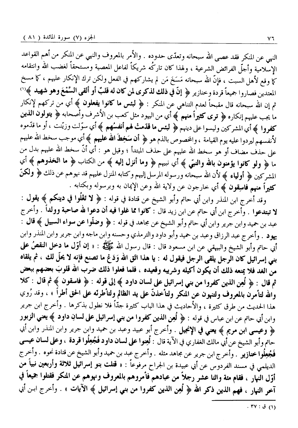 يَهُودُ. وَأَخْرَجَ عَبْدُ الرَّزَّاقِ وَعَبْدُ بْنُ حُمَيْدٍ وَأَبُو دَاوُدَ وَالتِّرْمِذِيُّ وَحَسَّنَهُ وَابْنُ مَاجَهْ وَابْنُ جَرِيرٍ وَابْنُ الْمُنْذِرِ وَابْنُ أَبِي حَاتِمٍ وَأَبُو الشَّيْخِ وَالْبَيْهَقِيُّ عَنِ ابْنِ مَسْعُودٍ قَالَ: قَالَ رَسُولُ اللَّهِ صَلَّى اللَّهُ عَلَيْهِ وَسَلَّمَ: «إِنَّ أَوَّلَ مَا دَخَلَ النَّقْصُ عَلَى بَنِي إِسْرَائِيلَ كَانَ الرَّجُلُ يَلْقَى الرَّجُلَ فَيَقُولُ لَهُ: يَا هَذَا اتَّقِ اللَّهَ وَدَعْ مَا تَصْنَعُ فَإِنَّهُ لَا يَحِلُّ لَكَ، ثُمَّ يَلْقَاهُ مِنَ الْغَدِ فَلَا يَمْنَعُهُ ذَلِكَ أَنْ يَكُونَ أَكِيلَهُ وَشَرِيبَهُ وَقَعِيدَهُ، فَلَمَّا فَعَلُوا ذَلِكَ ضَرَبَ اللَّهُ قُلُوبَ بَعْضِهِمْ بِبَعْضٍ ثُمَّ قَالَ: لُعِنَ الَّذِينَ كَفَرُوا مِنْ بَنِي إِسْرائِيلَ عَلى لِسانِ داوُدَ إِلَى قَوْلِهِ: فاسِقُونَ ثُمَّ قَالَ: كَلَّا وَاللَّهِ لَتَأْمُرُنَّ بِالْمَعْرُوفِ وَلَتَنْهَوُنَّ عَنِ الْمُنْكَرِ وَلَتَأْخُذُنَّ عَلَى يَدِ الظَّالِمِ وَلَتَأْطُرُنَّهُ عَلَى الْحَقِّ أَطْرًا» ، وَقَدْ رُوِيَ هَذَا الْحَدِيثُ مِنْ طُرُقٍ كَثِيرَةٍ، وَالْأَحَادِيثُ فِي هَذَا الْبَابِ كَثِيرَةٌ جِدًّا فَلَا نُطَوِّلُ بِذِكْرِهَا. وَأَخْرَجَ ابْنُ جَرِيرٍ وَابْنُ أَبِي حَاتِمٍ عَنِ ابْنِ عَبَّاسٍ فِي قَوْلِهِ: لُعِنَ الَّذِينَ كَفَرُوا مِنْ بَنِي إِسْرائِيلَ عَلى لِسانِ داوُدَ يعني الزَّبُورِ وَعِيسَى ابْنِ مَرْيَمَ يَعْنِي فِي الْإِنْجِيلِ. وَأَخْرَجَ أَبُو عُبَيْدٍ وَعَبْدُ بْنُ حُمَيْدٍ وَابْنُ جَرِيرٍ وَابْنُ الْمُنْذِرِ وَابْنُ أَبِي حَاتِمٍ وَأَبُو الشَّيْخِ عَنْ أَبِي مَالِكٍ الْغِفَارِيِّ فِي الْآيَةِ قَالَ: لُعِنُوا عَلَى لِسَانِ دَاوُدَ فَجُعِلُوا قِرَدَةً، وَعَلَى لِسَانِ عِيسَى فَجُعِلُوا خَنَازِيرَ. وَأَخْرَجَ ابْنُ جَرِيرٍ عَنْ مُجَاهِدٍ مِثْلَهُ. وَأَخْرَجَ عَبْدُ بْنُ حُمَيْدٍ وَأَبُو الشَّيْخِ عَنْ قَتَادَةَ نَحْوَهُ. وَأَخْرَجَ الدَّيْلَمِيُّ فِي مُسْنَدِ الْفِرْدَوْسِ عَنْ أَبِي عُبَيْدَةَ بْنِ الْجَرَّاحِ مَرْفُوعًا: «قَتَلَتْ بَنُو إِسْرَائِيلَ ثَلَاثَةً وَأَرْبَعِينَ نَبِيًّا مِنْ أَوَّلِ النَّهَارِ، فَقَامَ مِائَةٌ وَاثْنَا عَشَرَ رَجُلًا مِنْ عُبَّادِهِمْ فَأَمَرُوهُمْ بِالْمَعْرُوفِ وَنَهَوْهُمْ عَنِ الْمُنْكَرِ فَقُتِلُوا جَمِيعًا فِي آخِرِ النَّهَارِ، فَهُمُ الَّذِينَ ذَكَرَ اللَّهُ لُعِنَ الَّذِينَ كَفَرُوا مِنْ بَنِي إِسْرائِيلَ الْآيَاتِ» . وَأَخْرَجَ ابْنُ أبي
