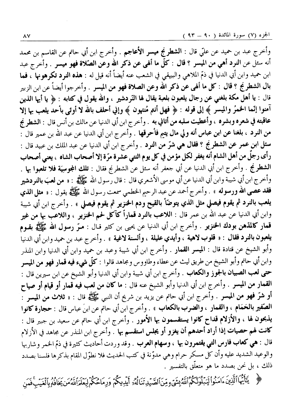 وَأَخْرَجَ عَبْدُ بْنُ حُمَيْدٍ عَنْ عَلِيٍّ قَالَ: الشِّطْرَنْجُ مَيْسِرُ الْأَعَاجِمِ. وَأَخْرَجَ ابْنُ أَبِي حَاتِمٍ عَنِ الْقَاسِمِ بْنِ مُحَمَّدٍ أَنَّهُ سُئِلَ عَنِ النَّرْدِ أَهِيَ مِنَ الْمَيْسِرِ؟ قَالَ: كُلُّ مَا أَلْهَى عَنْ ذِكْرِ اللَّهِ وَعَنِ الصَّلَاةِ فَهُوَ ميسر. وأخرج عبد ابن حُمَيْدٍ وَابْنُ أَبِي الدُّنْيَا فِي ذَمِّ الْمَلَاهِي وَالْبَيْهَقِيُّ فِي الشُّعَبِ عَنْهُ أَيْضًا أَنَّهُ قِيلَ لَهُ: هَذِهِ النَّرْدُ تَكْرَهُونَهَا، فَمَا بَالُ الشِّطْرَنْجِ؟ قَالَ: كُلُّ مَا أَلْهَى عَنْ ذِكْرِ اللَّهِ وَعَنِ الصَّلَاةِ فَهُوَ مِنَ الْمَيْسِرِ. وَأَخْرَجُوا أَيْضًا عَنِ ابْنِ الزُّبَيْرِ قَالَ: يَا أَهْلَ مَكَّةَ بَلَغَنِي عَنْ رِجَالٍ يَلْعَبُونَ بِلُعْبَةٍ يُقَالُ لَهَا النّردشير، والله يقول في كتابه: يَا أَيُّهَا الَّذِينَ آمَنُوا إِنَّمَا الْخَمْرُ وَالْمَيْسِرُ إِلَى قَوْلِهِ: فَهَلْ أَنْتُمْ مُنْتَهُونَ وَإِنِّي أَحْلِفُ بِاللَّهِ لَا أُوتَى بِأَحَدٍ يَلْعَبُ بِهَا إِلَّا عَاقَبْتُهُ فِي شَعْرِهِ وَبَشَرِهِ، وَأَعْطَيْتُ سَلَبَهُ مَنْ أَتَانِي بِهِ. وَأَخْرَجَ ابْنُ أَبِي الدُّنْيَا عَنْ مَالِكِ بْنِ أَنَسٍ قَالَ: الشِّطْرَنْجُ مِنَ النَّرْدِ، بَلَغَنَا عَنِ ابْنِ عَبَّاسٍ أَنَّهُ وَلِي مَالَ يَتِيمٍ فَأَحْرَقَهَا. وَأَخْرَجَ ابْنُ أَبِي الدُّنْيَا عَنْ عبد الله بن عمير قال: