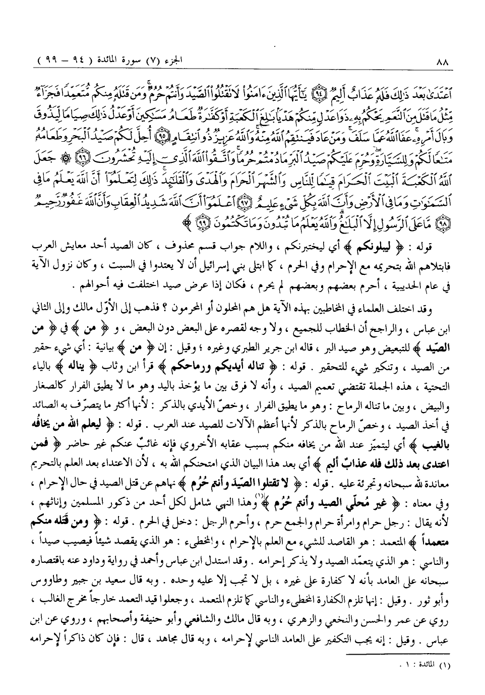 يَا أَيُّهَا الَّذِينَ آمَنُوا لَيَبْلُوَنَّكُمُ اللَّهُ بِشَيْءٍ مِنَ الصَّيْدِ تَنالُهُ أَيْدِيكُمْ وَرِماحُكُمْ لِيَعْلَمَ اللَّهُ مَنْ يَخافُهُ بِالْغَيْبِ فَمَنِ اعْتَدى بَعْدَ ذلِكَ فَلَهُ عَذابٌ أَلِيمٌ (94) يا أَيُّهَا الَّذِينَ آمَنُوا لَا تَقْتُلُوا الصَّيْدَ وَأَنْتُمْ حُرُمٌ وَمَنْ قَتَلَهُ مِنْكُمْ مُتَعَمِّداً فَجَزاءٌ مِثْلُ مَا قَتَلَ مِنَ النَّعَمِ يَحْكُمُ بِهِ ذَوا عَدْلٍ مِنْكُمْ هَدْياً بالِغَ الْكَعْبَةِ أَوْ كَفَّارَةٌ طَعامُ مَساكِينَ أَوْ عَدْلُ ذلِكَ صِياماً لِيَذُوقَ وَبالَ أَمْرِهِ عَفَا اللَّهُ عَمَّا سَلَفَ وَمَنْ عادَ فَيَنْتَقِمُ اللَّهُ مِنْهُ وَاللَّهُ عَزِيزٌ ذُو انْتِقامٍ (95) أُحِلَّ لَكُمْ صَيْدُ الْبَحْرِ وَطَعامُهُ مَتاعاً لَكُمْ وَلِلسَّيَّارَةِ وَحُرِّمَ عَلَيْكُمْ صَيْدُ الْبَرِّ مَا دُمْتُمْ حُرُماً وَاتَّقُوا اللَّهَ الَّذِي إِلَيْهِ تُحْشَرُونَ (96) جَعَلَ اللَّهُ الْكَعْبَةَ الْبَيْتَ الْحَرامَ قِياماً لِلنَّاسِ وَالشَّهْرَ الْحَرامَ وَالْهَدْيَ وَالْقَلائِدَ ذلِكَ لِتَعْلَمُوا أَنَّ اللَّهَ يَعْلَمُ مَا فِي السَّماواتِ وَما فِي الْأَرْضِ وَأَنَّ اللَّهَ بِكُلِّ شَيْءٍ عَلِيمٌ (97) اعْلَمُوا أَنَّ اللَّهَ شَدِيدُ الْعِقابِ وَأَنَّ اللَّهَ غَفُورٌ رَحِيمٌ (98)