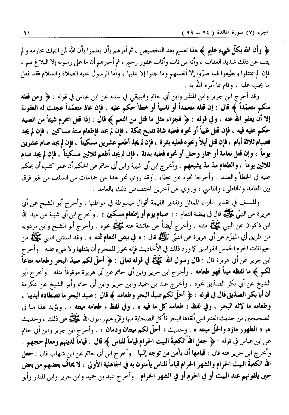 وَلِلسَّلَفِ فِي تَقْدِيرِ الْجَزَاءِ الْمُمَاثِلِ وَتَقْدِيرِ الْقِيمَةِ أَقْوَالٌ مَبْسُوطَةٌ فِي مَوَاطِنِهَا. وَأَخْرَجَ أَبُو الشَّيْخِ عَنْ أَبِي هُرَيْرَةَ عَنِ النَّبِيِّ صَلَّى اللَّهُ عَلَيْهِ وَسَلَّمَ قَالَ فِي بَيْضَةِ النَّعَامِ: «صِيَامُ يَوْمٍ أَوْ إِطْعَامُ مِسْكِينٍ» . وَأَخْرَجَ ابْنُ أَبِي شَيْبَةَ عَنْ عَبْدِ اللَّهِ ابن ذكوان عَنِ النَّبِيِّ صَلَّى اللَّهُ عَلَيْهِ وَسَلَّمَ مِثْلَهُ. وَأَخْرَجَ أَيْضًا عَنْ عَائِشَةَ عَنْهُ صلّى الله عليه وَسَلَّمَ نَحْوَهُ. وَأَخْرَجَ أَبُو الشَّيْخِ وَابْنُ مَرْدَوَيْهِ مِنْ طَرِيقِ أَبِي الْمُهَزِّمِ عَنْ أَبِي هُرَيْرَةَ عَنِ النَّبِيِّ صَلَّى اللَّهُ عَلَيْهِ وَسَلَّمَ قَالَ: «فِي بَيْضِ النَّعَامِ ثَمَنُهُ» . وَقَدِ استثنى النبي صلّى الله عليه وَسَلَّمَ مِنْ حَيَوَانَاتِ الْحَرَمِ الْخَمْسِ الْفَوَاسِقِ كَمَا وَرَدَ ذَلِكَ فِي الْأَحَادِيثِ فَإِنَّهُ يَجُوزُ لِلْمُحْرِمِ أَنْ يَقْتُلَهَا وَلَا شَيْءَ عَلَيْهِ. وَأَخْرَجَ ابْنُ جَرِيرٍ عَنْ أَبِي هُرَيْرَةَ قَالَ: قَالَ رَسُولُ اللَّهِ صَلَّى اللَّهُ عَلَيْهِ وَسَلَّمَ فِي قَوْلِهِ تَعَالَى: أُحِلَّ لَكُمْ صَيْدُ الْبَحْرِ وَطَعامُهُ مَتاعاً لَكُمْ مَا لَفِظَهُ مَيِّتًا فَهُوَ طَعَامُهُ. وَأَخْرَجَ ابْنُ جَرِيرٍ وَابْنُ أَبِي حَاتِمٍ عَنْ أَبِي هُرَيْرَةَ مَوْقُوفًا مِثْلَهُ. وَأَخْرَجَ أَبُو الشَّيْخِ عَنْ أَبِي بَكْرٍ الصِّدِّيقِ نَحْوَهُ. وَأَخْرَجَ عَبْدُ بْنُ حُمَيْدٍ وَابْنُ جَرِيرٍ وَابْنُ أَبِي حَاتِمٍ وَأَبُو الشَّيْخِ عَنْ عِكْرِمَةَ أَنَّ أَبَا بَكْرٍ الصِّدِّيقَ قَالَ فِي قَوْلِهِ: أُحِلَّ لَكُمْ صَيْدُ الْبَحْرِ وَطَعامُهُ قَالَ: صَيْدُ الْبَحْرِ مَا تَصْطَادُهُ أَيْدِينَا، وَطَعَامُهُ مَا لَاثَهُ الْبَحْرُ، وفي لفظ «طعامه كُلُّ مَا فِيهِ» . وَفِي لَفْظٍ «طَعَامُهُ مَيْتَتُهُ» . وَيُؤَيِّدُ هَذَا مَا فِي الصَّحِيحَيْنِ مِنْ حَدِيثِ العنبر الَّتِي أَلْقَاهَا الْبَحْرُ فَأَكَلَ الصَّحَابَةُ مِنْهَا وَقَرَّرَهُمْ رَسُولَ اللَّهِ صَلَّى اللَّهُ عَلَيْهِ وَسَلَّمَ عَلَى ذَلِكَ، وَحَدِيثُ هُوَ «الطَّهُورُ مَاؤُهُ وَالْحِلُّ مَيْتَتُهُ» . وَحَدِيثُ «أُحِلَّ لَكُمْ مَيْتَتَانِ وَدَمَانِ» . وَأَخْرَجَ ابْنُ جَرِيرٍ وَابْنُ أَبِي حَاتِمٍ عَنِ ابْنِ عَبَّاسٍ فِي قَوْلِهِ: جَعَلَ اللَّهُ الْكَعْبَةَ الْبَيْتَ الْحَرامَ قِياماً لِلنَّاسِ قَالَ: قِيَامًا لِدِينِهِمْ وَمَعَالِمَ حَجِّهِمْ.