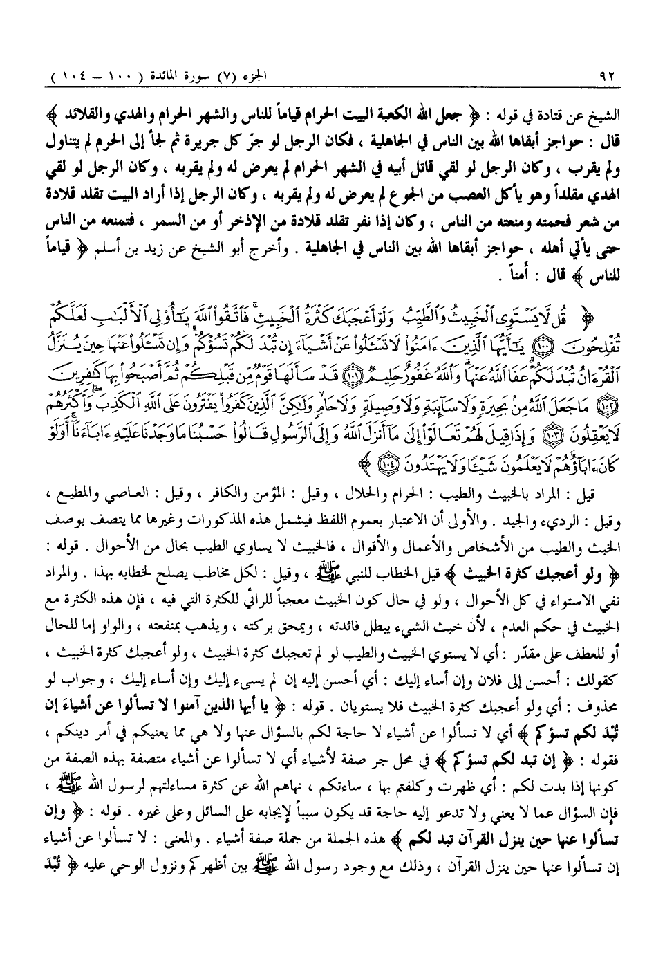 قُلْ لَا يَسْتَوِي الْخَبِيثُ وَالطَّيِّبُ وَلَوْ أَعْجَبَكَ كَثْرَةُ الْخَبِيثِ فَاتَّقُوا اللَّهَ يَا أُولِي الْأَلْبابِ لَعَلَّكُمْ تُفْلِحُونَ (100) يَا أَيُّهَا الَّذِينَ آمَنُوا لَا تَسْئَلُوا عَنْ أَشْياءَ إِنْ تُبْدَ لَكُمْ تَسُؤْكُمْ وَإِنْ تَسْئَلُوا عَنْها حِينَ يُنَزَّلُ الْقُرْآنُ تُبْدَ لَكُمْ عَفَا اللَّهُ عَنْها وَاللَّهُ غَفُورٌ حَلِيمٌ (101) قَدْ سَأَلَها قَوْمٌ مِنْ قَبْلِكُمْ ثُمَّ أَصْبَحُوا بِها كافِرِينَ (102) مَا جَعَلَ اللَّهُ مِنْ بَحِيرَةٍ وَلا سائِبَةٍ وَلا وَصِيلَةٍ وَلا حامٍ وَلكِنَّ الَّذِينَ كَفَرُوا يَفْتَرُونَ عَلَى اللَّهِ الْكَذِبَ وَأَكْثَرُهُمْ لَا يَعْقِلُونَ (103) وَإِذا قِيلَ لَهُمْ تَعالَوْا إِلى مَا أَنْزَلَ اللَّهُ وَإِلَى الرَّسُولِ قالُوا حَسْبُنا مَا وَجَدْنا عَلَيْهِ آباءَنا أَوَلَوْ كانَ آباؤُهُمْ لَا يَعْلَمُونَ شَيْئاً وَلا يَهْتَدُونَ (104)