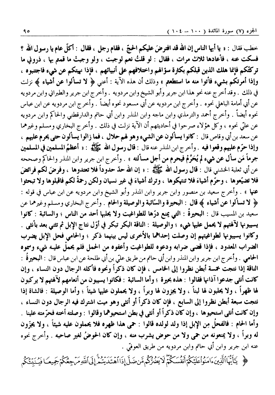 لا تَسْئَلُوا عَنْ أَشْياءَ قال: البحيرة والسّائبة والوصيلة والحاكم. وَأَخْرَجَ الْبُخَارِيُّ وَمُسْلِمٌ وَغَيْرُهُمَا عَنْ سَعِيدِ بْنِ الْمُسَيَّبِ قَالَ: الْبَحِيرَةُ: الَّتِي يُمْنَعُ دَرُّهَا لِلطَّوَاغِيتِ وَلَا يَحْلِبُهَا أَحَدٌ مِنَ النَّاسِ وَالسَّائِبَةُ: كَانُوا يُسَيِّبُونَهَا لِآلِهَتِهِمْ لَا يُحْمَلُ عَلَيْهَا شَيْءٌ وَالْوَصِيلَةُ: النَّاقَةُ الْبِكْرُ تُبَكِّرُ فِي أَوَّلِ نِتَاجِ الْإِبِلِ ثُمَّ تُثَنِّي بَعْدُ بِأُنْثَى.