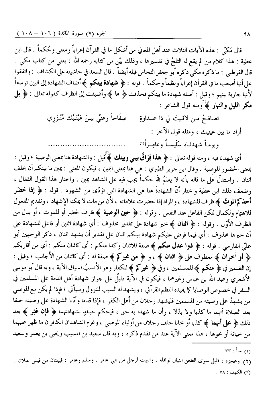 قَالَ الْقُرْطُبِيُّ: مَا ذَكَرَهُ مَكِّيٌّ ذَكَرَهُ أَبُو جَعْفَرٍ النَّحَّاسُ قَبْلَهُ أَيْضًا. قَالَ السَّعْدُ فِي حَاشِيَتِهِ عَلَى الْكَشَّافِ: وَاتَّفَقُوا عَلَى أَنَّهَا أَصْعَبُ مَا فِي الْقُرْآنِ إِعْرَابًا وَنَظْمًا وَحُكْمًا. قَوْلُهُ: شَهادَةُ بَيْنِكُمْ أَضَافَ الشَّهَادَةَ إِلَى الْبَيْنِ تَوَسُّعًا لِأَنَّهَا جَارِيَةٌ بَيْنَهُمْ وَقِيلَ: أَصْلُهُ شَهَادَةُ مَا بَيْنَكُمْ فَحُذِفَتْ مَا وَأُضِيفَتْ إِلَى الظَّرْفِ كَقَوْلِهِ تَعَالَى: بَلْ مَكْرُ اللَّيْلِ وَالنَّهارِ «1» وَمِنْهُ قَوْلُ الشَّاعِرِ:
