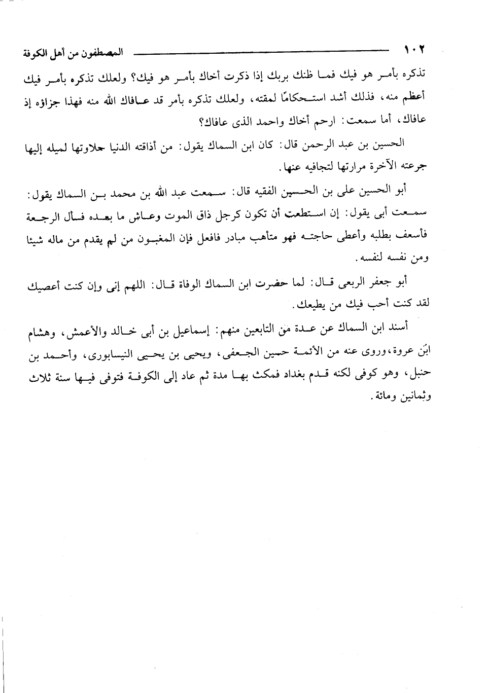 أبو الحسين علي بن الحسين الفقيه قال: سمعت عبد الله بن محمد بن السماك يقول: سمعت أبي يقول: إن استطعت أن تكون كرجل ذاق الموت وعاش ما بعده فسأل الرجعة فأسعف بطلبه وأعطي حاجته فهو متأهب مبادر، فافعل فإن المغبون من لم يقدم من ماله شيئاً ومن نفسه لنفسه.