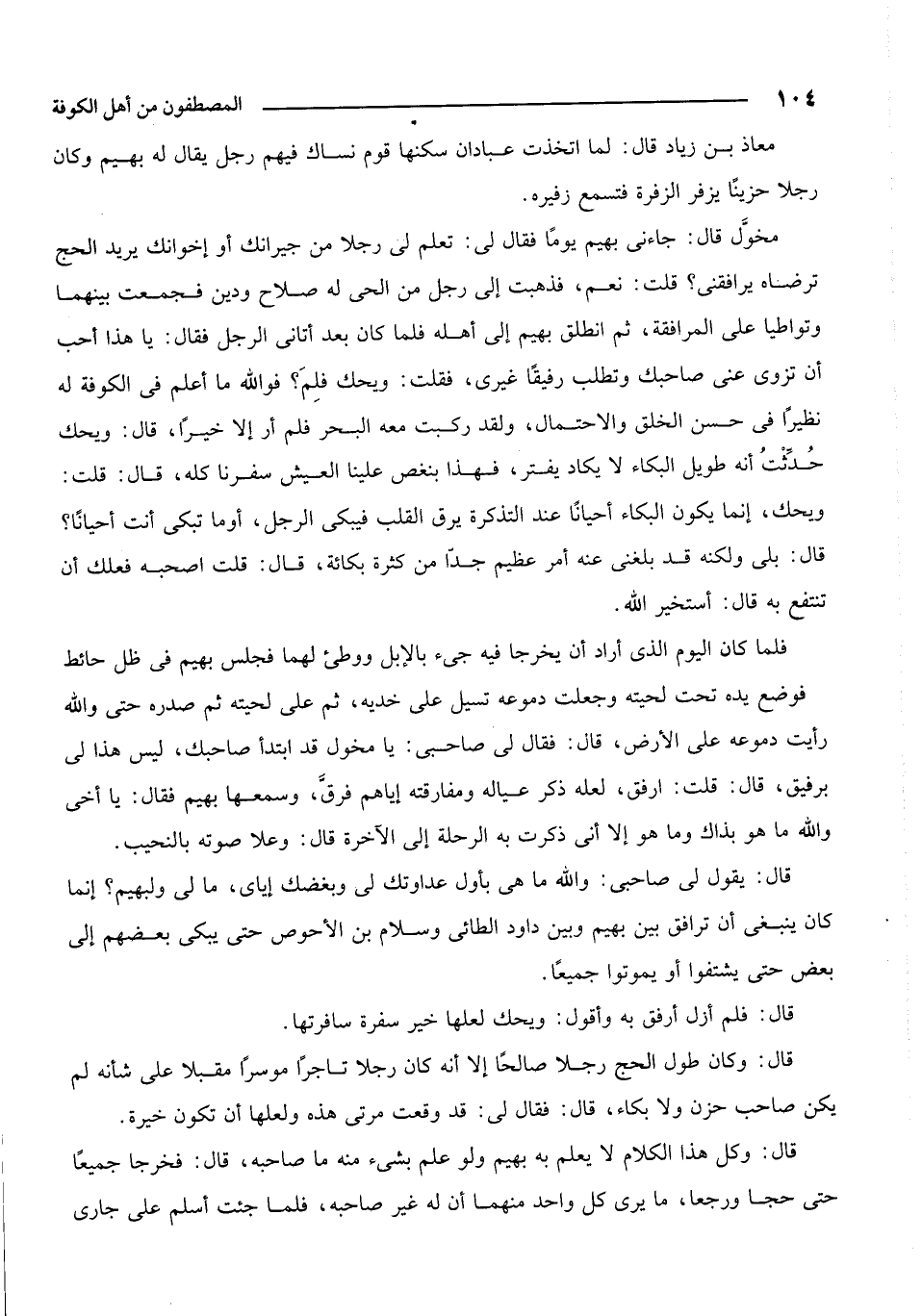 قال: يقول لي صاحبي: والله ما هي بأول عداوتك لي وبغضك إياي، ما لي ولبهيم؟ إنما كان ينبغي أن ترافق بين بهيم وبين داود الطائي وسلام بن الأحوص، حتى يبكي بعضهم إلى بعض حتى يشتفوا أو يموتوا جميعاً.