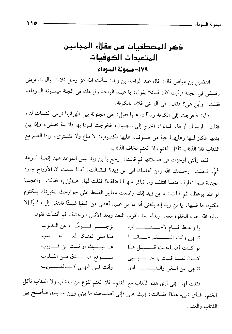 قال: فخرجت إلى الكوفة وسألت عنها فقيل: هي مجنونة بين ظهرانينا ترعى غنيمات لنا، فقلت: أريد أن أراها. قالوا: اخرج إلى الجبان، فخرجت فإذا بها قائمة تصلي، وإذا بين يديها عكاز لها وعليها جبة من صوف، عليها مكتوب: لا تباع ولا تشترى. وإذا الغنم مع الذئاب، فلا الذئاب تأكل الغنم ولا الغنم تخاف الذئاب.