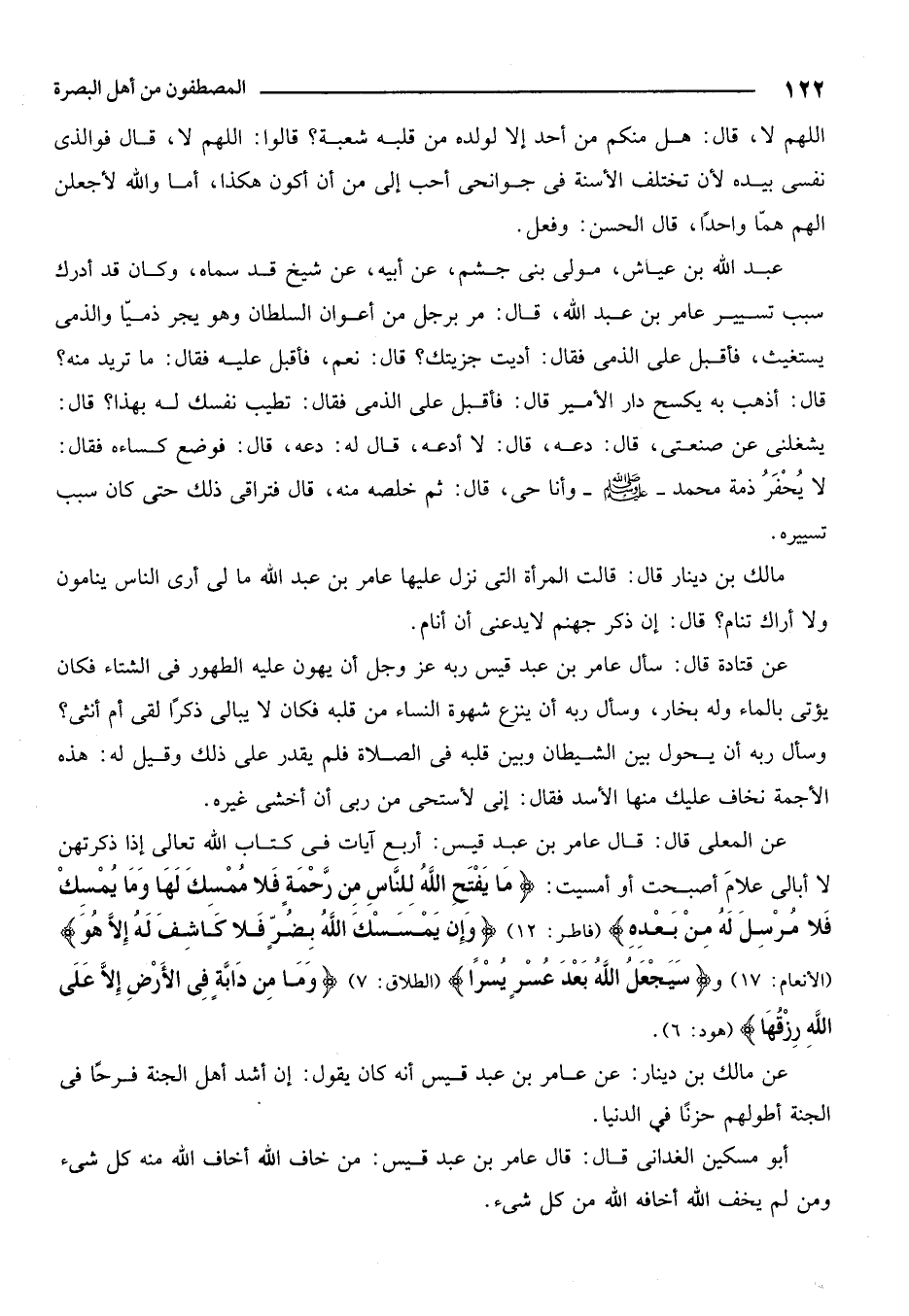 عن المعلى قال: قال عامر بن عبد قيس: أربع آيات من كتاب الله تعالى إذا ذكرتهن لا أبالي على ما أصبحت وأمسيت {مَا يَفْتَحِ اللَّهُ لِلنَّاسِ مِنْ رَحْمَةٍ فَلا مُمْسِكَ لَهَا وَمَا يُمْسِكْ فَلا مُرْسِلَ لَهُ مِنْ بَعْدِهِ} [فاطر: 12] {وَإِنْ يَمْسَسْكَ اللَّهُ بِضُرٍّ فَلا كَاشِفَ لَهُ إِلَّا هُوَ} [الأنعام: 17] و {سَيَجْعَلُ اللَّهُ بَعْدَ عُسْرٍ يُسْراً} [الطلاق: 7] {وَمَا مِنْ دَابَّةٍ فِي الْأَرْضِ إِلَّا عَلَى اللَّهِ رِزْقُهَا} [هود: 6] .