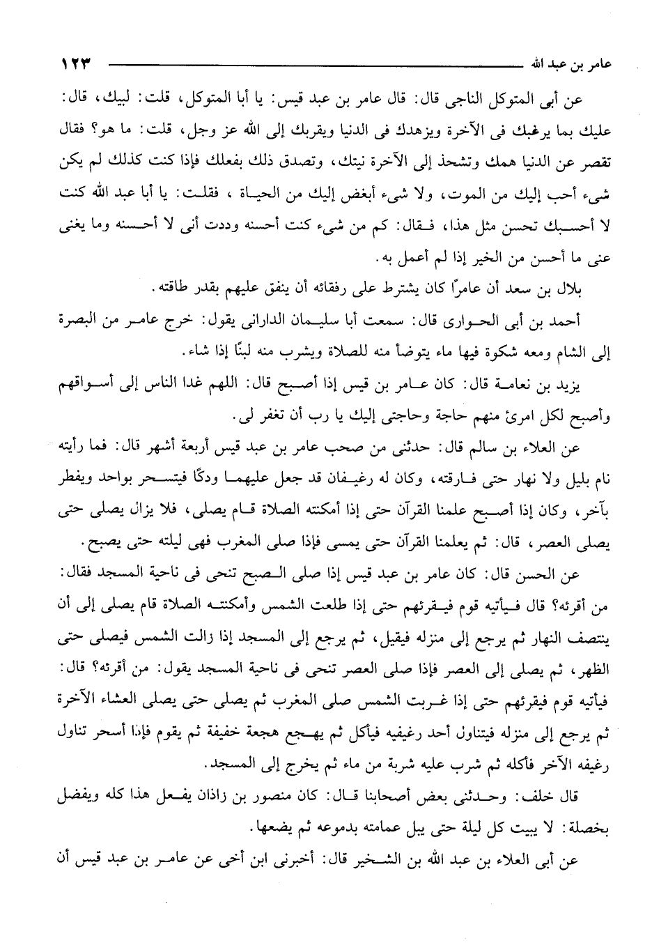 عن الحسن قال: كان عامر بن عبد قيس إذا صلى الصبح تنحى في ناحية المسجد فقال: من أقرئه؟ قال: فيأتيه قوم فيقرئهم، حتى إذا طلعت الشمس وأمكنته الصلاة قام يصلي إلى أن ينتصف النهار ثم يرجع إلى منزله فيقيل، ثم يرجع إلى المسجد إذا زالت الشمس فيصلي حتى يصلي الظهر، ثم يصلي إلى العصر فإذا صلى العصر تنحى في ناحية المسجد ثم يقول: من أقرئه؟ قال: فيأتيه قوم فيقرئهم حتى إذا غربت الشمس صلى المغرب ثم يصلي حتى يصلي العشاء الآخرة ثم يرجع إلى منزله فيتناول أحد رغيفيه فيأكل ثم يهجع هجعة خفيفة، ثم يقول. فإذا أسحر تناول رغيفه الآخر فأكله ثم شرب عليه شربة من ماء ثم يخرج إلى المسجد.
