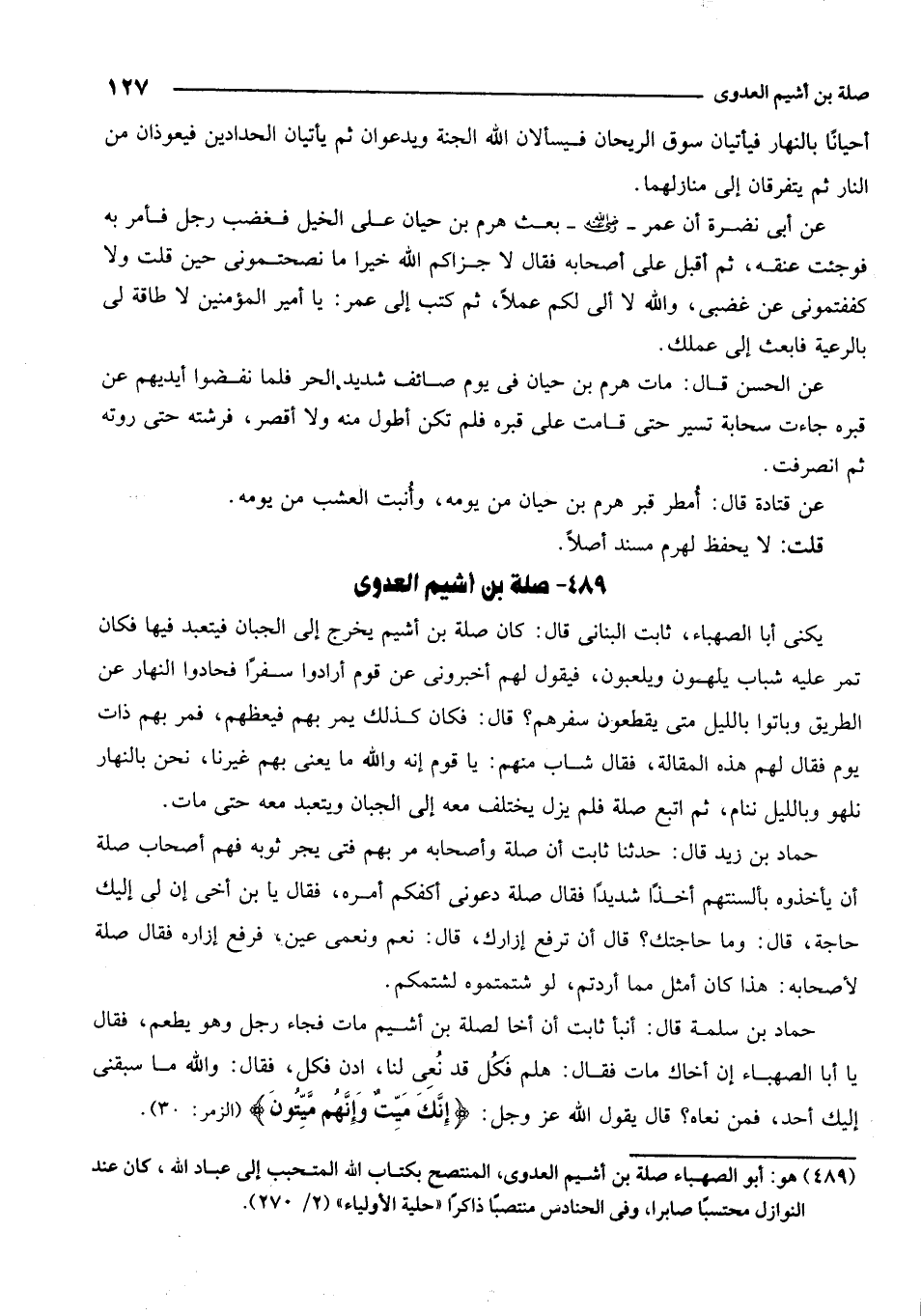489 - هو: أبو الصهباء صلة بن أشيم العدوي، المنتصح بكتاب الله المتحبب إلى عباد الله، كان عند النوازل محتسبا صابرا، وفي الخنادس منتصبا ذاكرا حلية الأولياء 2/270.