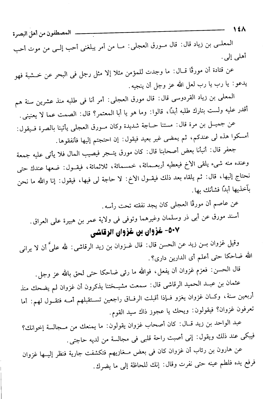 المعلى بن زياد القردوسي قال: قال مورق العجلي: أمر أنا في طلبه منذ عشرين سنة هم أقدر عليه ولست بتارك طلبه أبداً، قالوا: وما هو يا أبا المعتمر؟ قال: الصمت عما لا يعنيني.