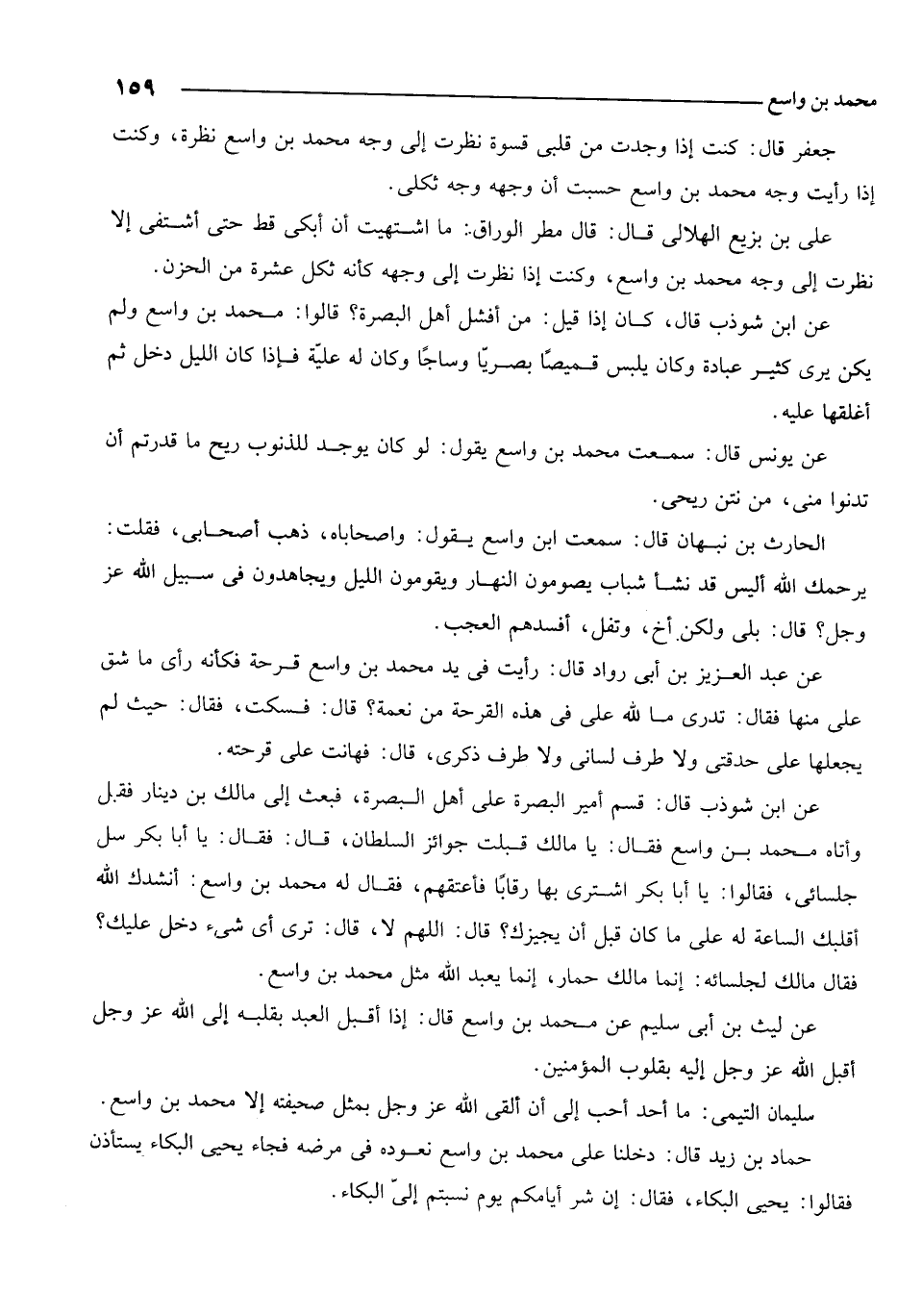 جعفر قال: كنت إذا وجدت من قلبي قسوة نظرت إلى وجه محمد بن واسع نظرة، وكنت إذا رأيت وجه محمد بن واسع حسبت أن وجهه وجه ثكلى.