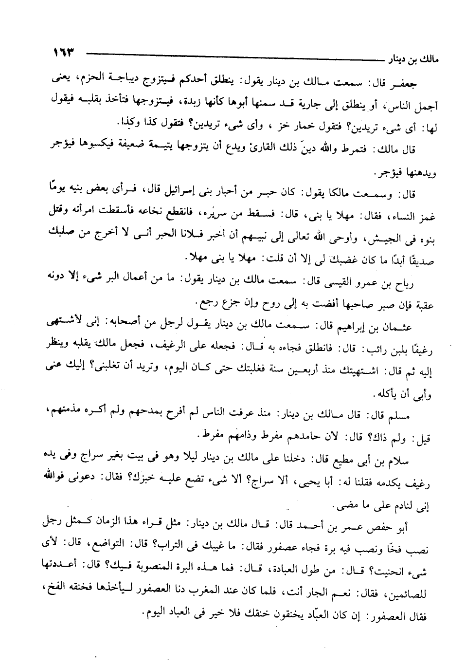 جعفر قال: سمعت مالك بن دينار يقول: ينطلق أحدكم فيتزوج ديباجة الحرم، يعني أجمل الناس، أو ينطلق إلى جارية قد سمنها أبوها كأنها زبدة، فيتزوجها فتأخذ بقلبه فيقول لها: أي شيء تريدين؟ فتقول: خمار خز، وأي شيء تريدين؟ فتقول كذا وكذا.