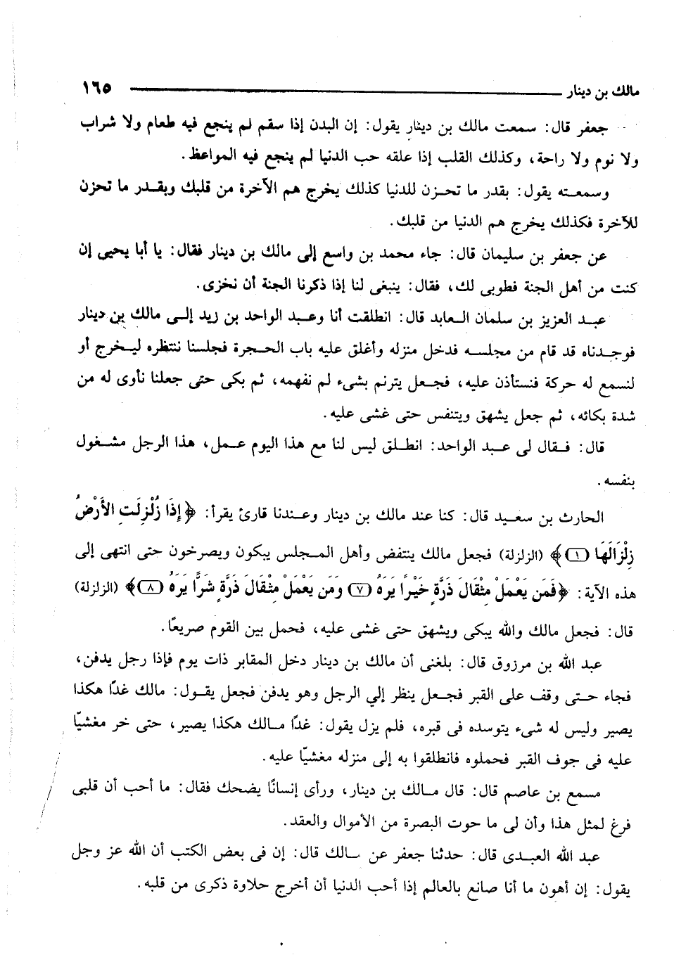 الحارث بن سعيد قال: كنا عند مالك بن دينار وعندنا قارئ يقرأ: {إِذَا زُلْزِلَتِ الْأَرْضُ زِلْزَالَهَا} الزلزلة فجعل مالك ينتفض وأهل المجلس يبكون ويصرخون حتى انتهى إلى هذه الآية: {فَمَنْ يَعْمَلْ مِثْقَالَ ذَرَّةٍ خَيْراً يَرَهُ، وَمَنْ يَعْمَلْ مِثْقَالَ ذَرَّةٍ شَرّاً يَرَهُ} الزلزلة قال: فجعل مالك، والله، يبكي ويشهق حتى غشي عليه فحمل بين القوم صريعاً.