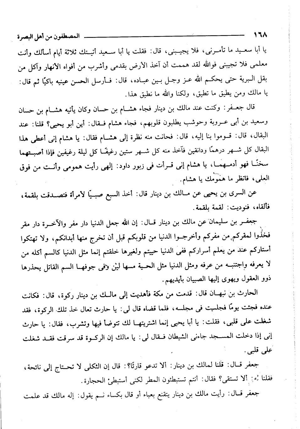 قال جعفر: وكنت عند مالك بن دينار فجاء هشام بن حسان، وكان يأتيه هشام ابن حسان وسعيد بن أبي عروبة وحوشب يطلبون قلوبهم، فجاء هشام فقال: أين أبو يحيى؟ قلنا: عند البقال. قال: قوموا بنا إليه. قال: فحانت منه نظرة إلى هشام فقال: يا هشام إني أعطي هذا البقال كل شهر درهماً ودانقين فآخذ منه كل شهر ستين رغيفاً كل ليلة رغيفين فإذا أصبتهما سخناً فهو أدمهما، يا هشام إني قرأت في زبور داود: إلهي رأيت همومي وأنت من فوق العلى، فانظر ما همومك يا هشام.
