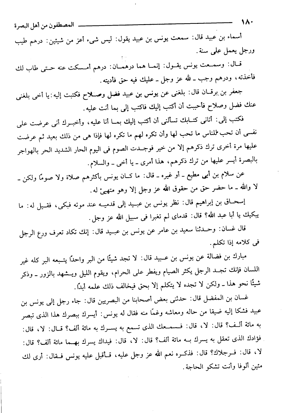 أسماء بن عبيد قال: سمعت يونس بن عبيد يقول: ليس شيء أعز من شيئين: درهم طيب ورجل يعمل على سنة.