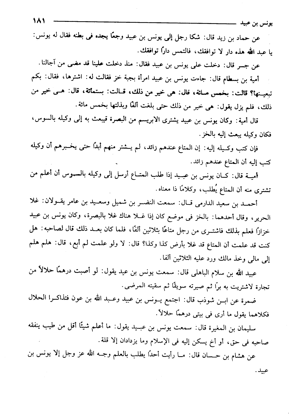 قال أمية: وكان يونس بن عبيد يشتري الابرسيم من البصرة فيبعث به إلى وكيله بالسوس. فكان وكيله يبعث إليه بالخز.