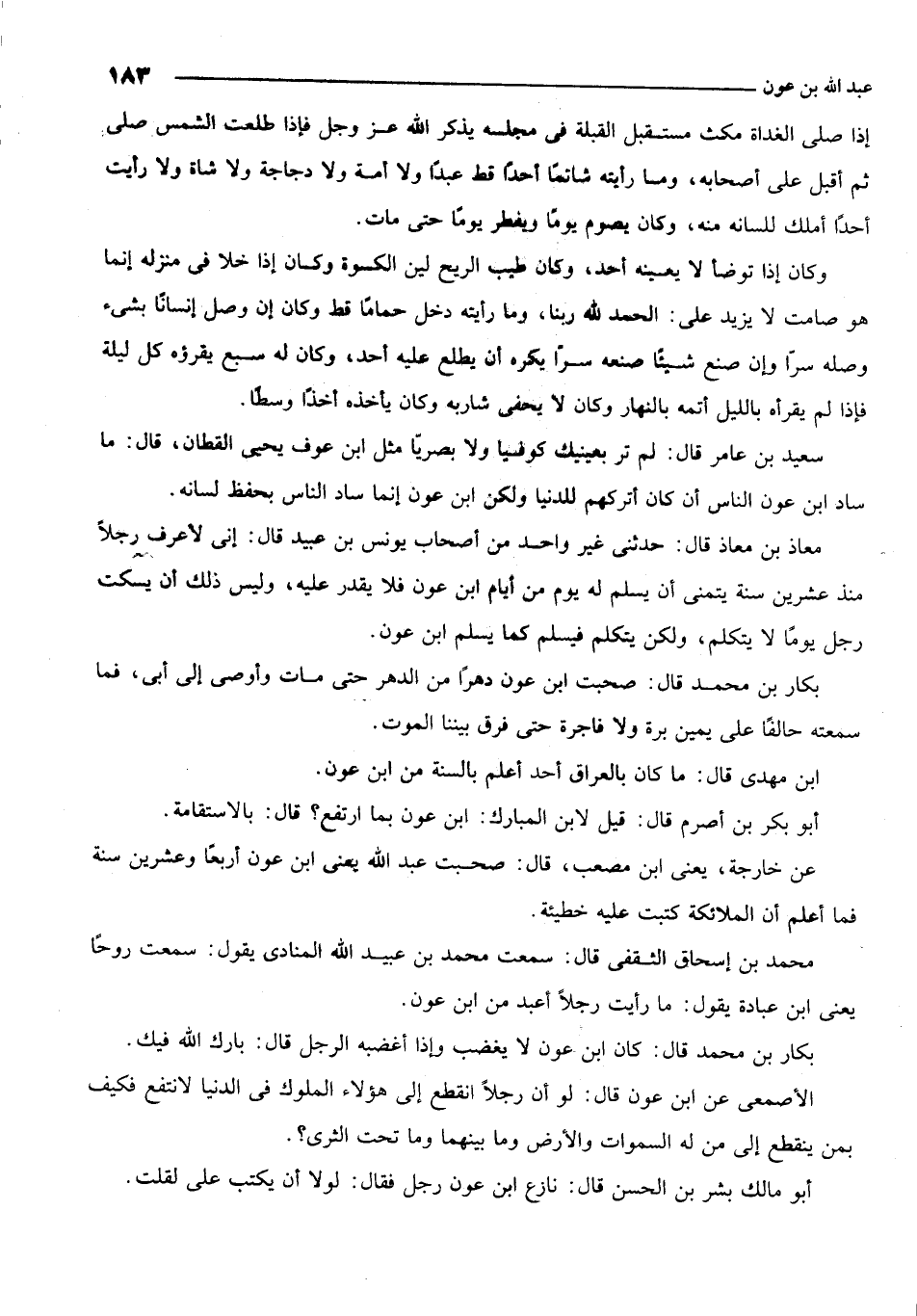 محمد بن إسحاق الثقفي قال: سمعت محمد بن عبيد الله المنادي يقول: سمعت روحاً يعني اب عبادة يقول: ما رأيت رجلاً أعبد من ابن عون.