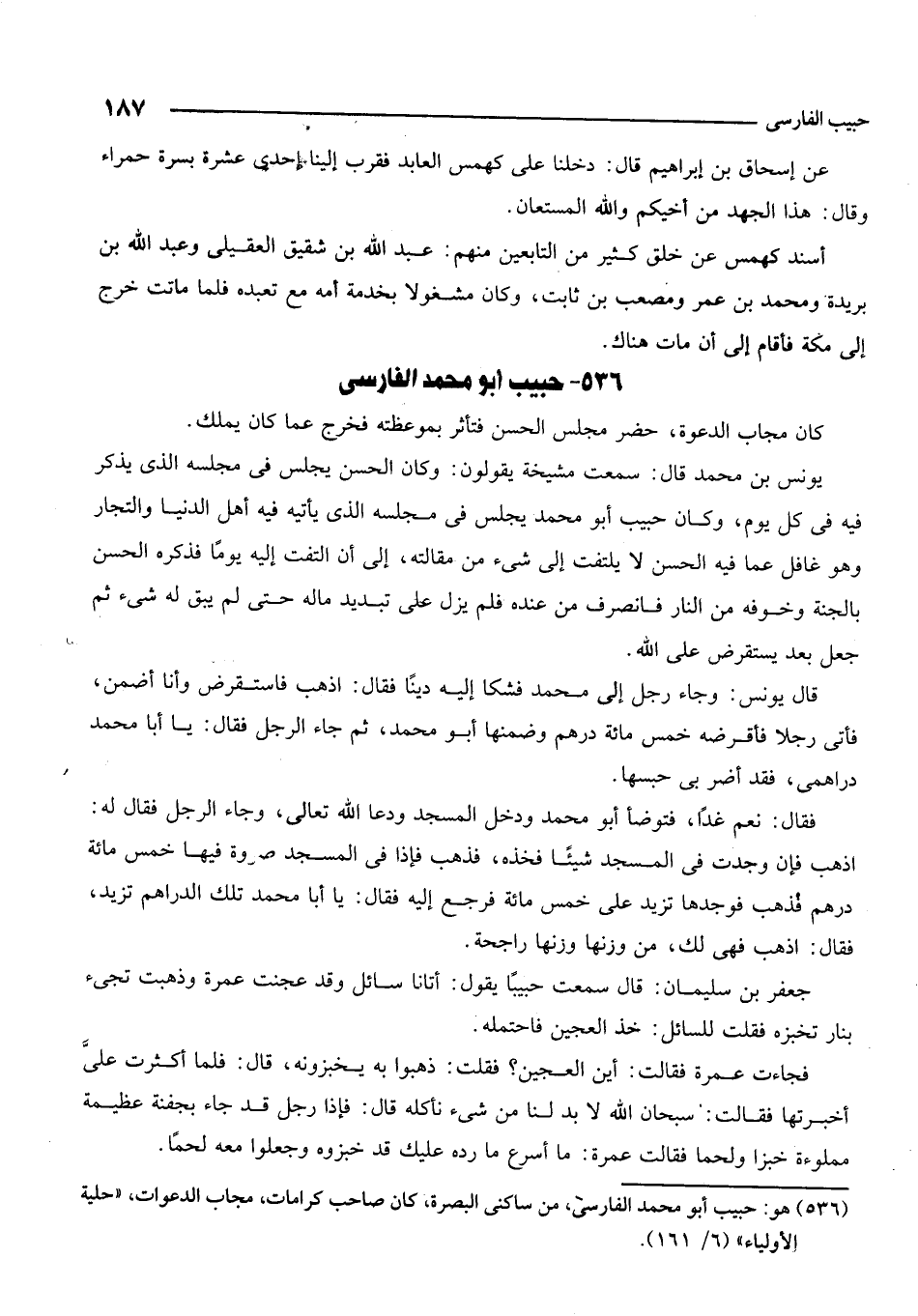 536 - هو: حبيب أبو محمد الفارسي، من ساكني البصرة، كان صاحب كرامات، مجاب الدعوات، حاية الأولياء 6/161.