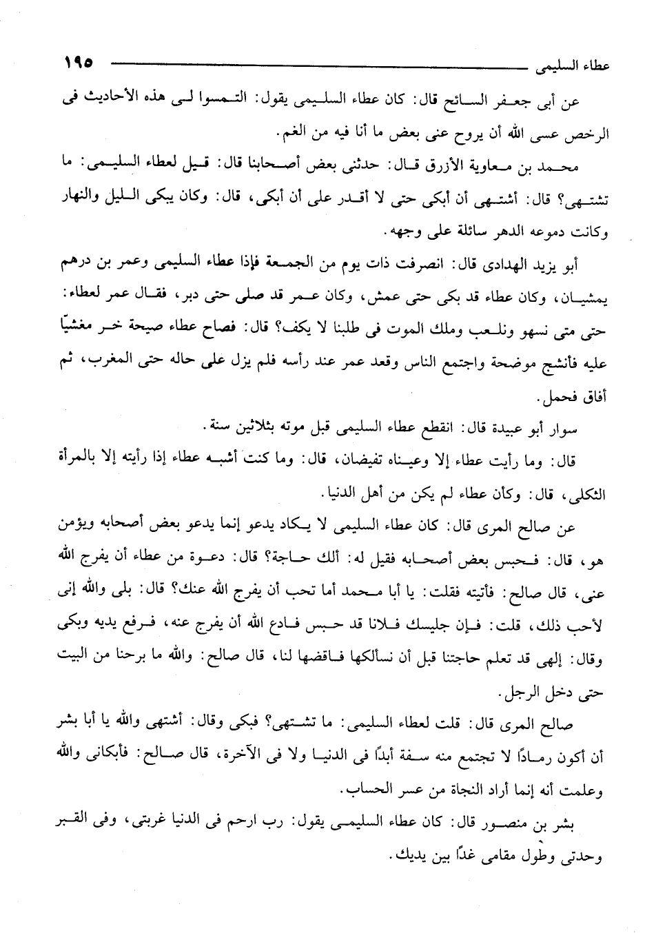 محمد بن معاوية الأزرق قال: حدثني بعض أصحابنا قال: قيل لعطاء السليمي ما تشتهي؟ قال: أشتهي أن أبكي حتى لا أقدر على أن أبكي. قال: وكان يبكي الليل والنهار وكانت دموعه الدهر سائلة على وجهه.