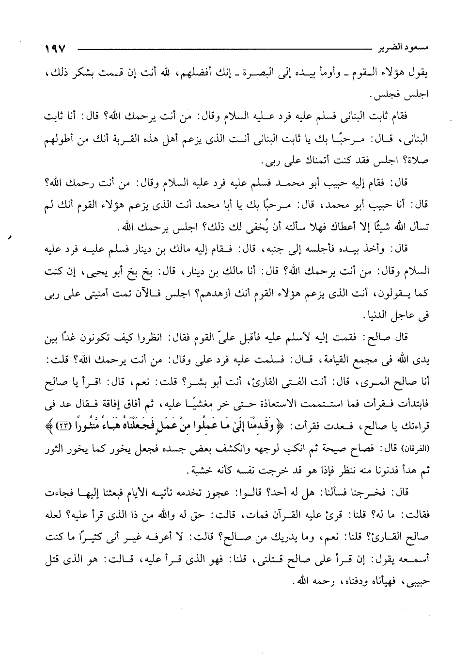 قال صالح: فمت إليه لأسلم عليه فأقبل علي القوم فقال: انظروا كيف تكونون غداً بين يدي الله في مجمع القيامة. قال: فسلمت عليه فرد علي وقال: من أنت يرحمك الله؟ قلت أنا صالح المري، قال: أنت الفتى القارئ، أنت أبو بشر؟ قلت: نعم، قال: اقرأ يا صالح فابتدأت فقرأت فما استتممت الاستعاذة حتى خر مغشياً عليه. ثم أفاق إفاقة فقال عد في قراءتك يا صالح، فعدت فقرأت: {وَقَدِمْنَا إِلَى مَا عَمِلُوا مِنْ عَمَلٍ فَجَعَلْنَاهُ هَبَاءً مَنْثُوراً} الفرقان قال: فصاح صيحة ثم انكب لوجهه وانكشف بعض جسده فجعل يخور كما يخور الثور ثم هدأ فدنونا منه ننظر فإذا هو قد خرجت نفسه كأنه خشبة.