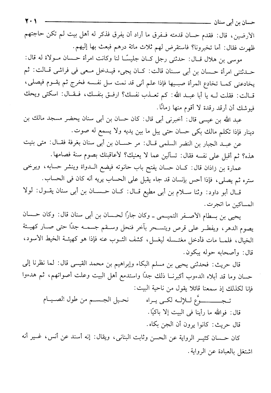 موسى بن هلال قال: حدثني رجل كان جليساً لنا وكانت امرأة حسان مولاة له قال: حدثتني امرأة حسان بن أبي سنان قالت: كان يجيء فيدخل معي في فراشي، قالت: ثم يخادعني كما تخادع المرأة صبيها فإذا علم أني قد نمت سل نفسه فخرج ثم يقوم فيصلي، قالت: فقلت له يا أبا عبد الله: كم تعذب نفسك؟ أرفق بنفسك، فقال: اسكتي ويحك فيوشك أن أرقد رقدة لا أقوم منها زماناً.