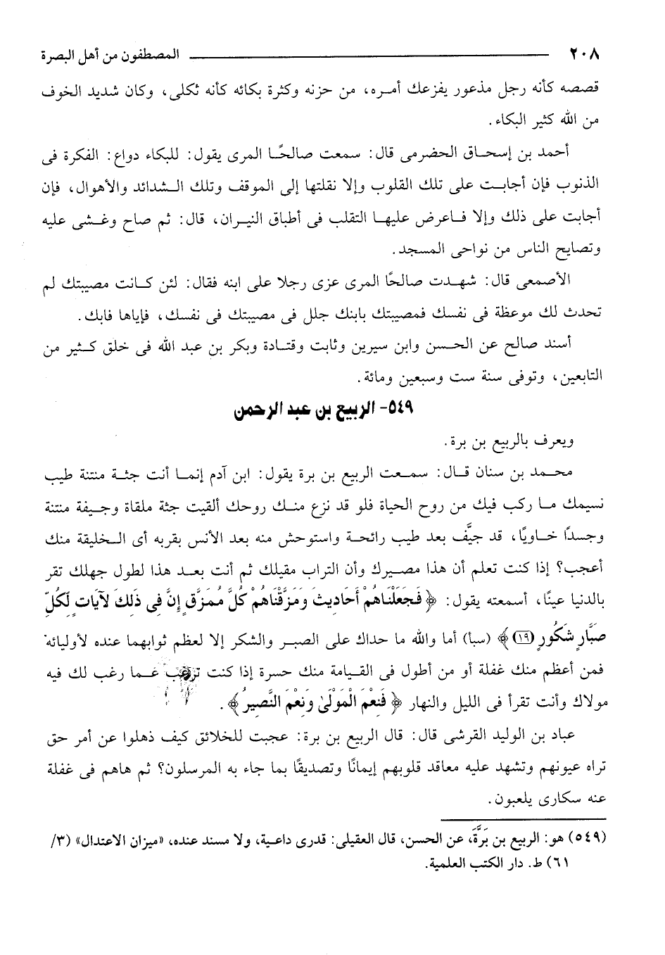 محمد بن سنان قال: سمعت الربيع بن برة يقول: ابن آدم إنما أنت جثة منتنة طيب نسيمك ما ركب فيك من روح الحياة فلو قد نزع منك روحك ألقيت جثة ملقاة وجيفة منتنة وجسداً خاوياً. قد جيف بعد طيب رائحة واستوحش منه بعد الأنس بقربه أي الخليفة منك أعجب إذ كنت تعلم أن هذا مصيرك وأن التراب مقيلك ثم أنت بعد هذا الطول جهلك تقر بالدنياعيناً. أسمعته يقول: {فَجَعَلْنَاهُمْ أَحَادِيثَ وَمَزَّقْنَاهُمْ كُلَّ مُمَزَّقٍ إِنَّ فِي ذَلِكَ لَآياتٍ لِكُلِّ صَبَّارٍ شَكُورٍ} "سبأ" أما والله ما حداك على الصبر والشكر إلا لعظم ثوابهما عنده لأوليائه فمن أعظم منك غفلة أو من أطول في القيامة منك حسرة إذ كنت ترغب عما رغب لك فيه مولاك وأنت تقرأ في الليل والنهار {نِعْمَ الْمَوْلَى وَنِعْمَ النَّصِيرُ} .