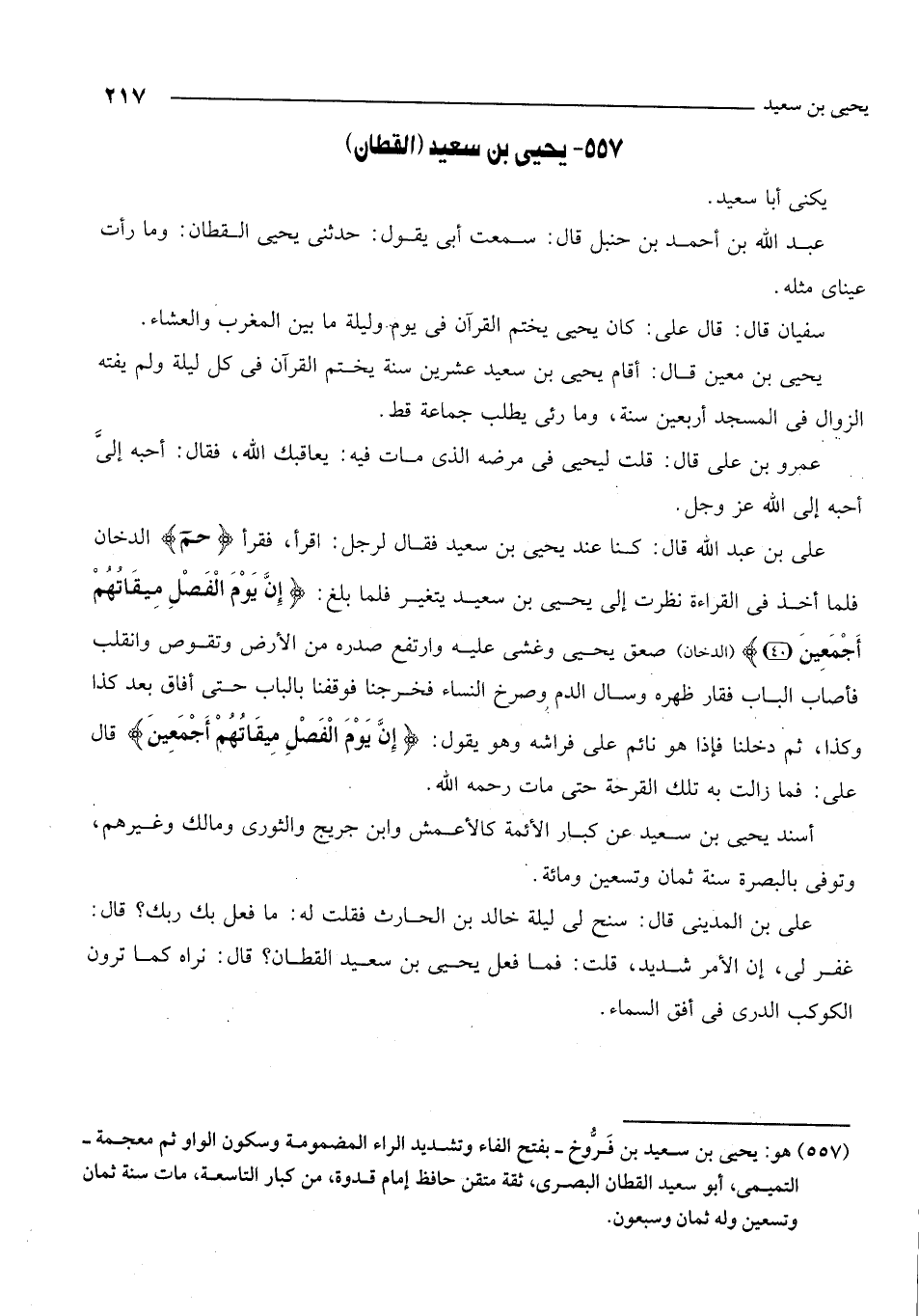 557 - هو: يحيى بن سعيد بن فروخ -بفتح الفاء وتشديد الراء المضمومة وسكون الواو ثم معجمة - التميمي، أبو سعيد القطان البصري، ثقة متقن حافظ إمام قدوة، من كبار التاسعة، مات سنة ثمان وتسعين وله ثمان وسبعون.