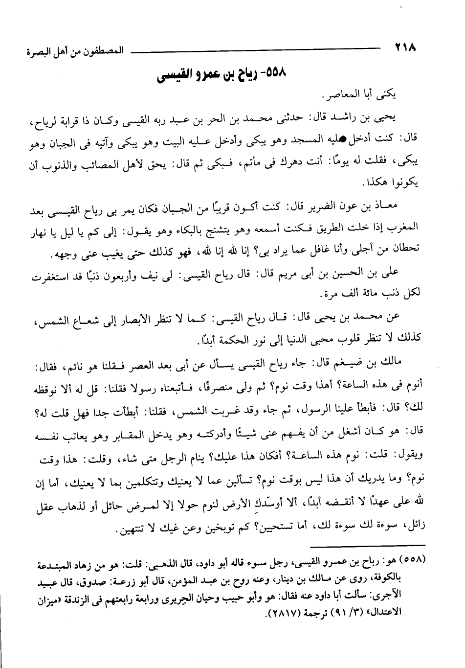 558 - هو: رباح بن عمرو القيسي، رجل سوء قاله أبو داود، قال الذهبي: قلت: هو من زهاد المبتدعة بالكوفة، روى عن مالك بن دينار، وعنه روح بن عبد المؤمن، قال أبو زرعة: صدوق، قال عبيد الآجري: سألت أبا داود عنه فقال: هو وأبو حبيب وحيان الجريري ورابعة رابعتهم في الزندقة ميزان الاعتدال 3/91 ترجمة 2817.