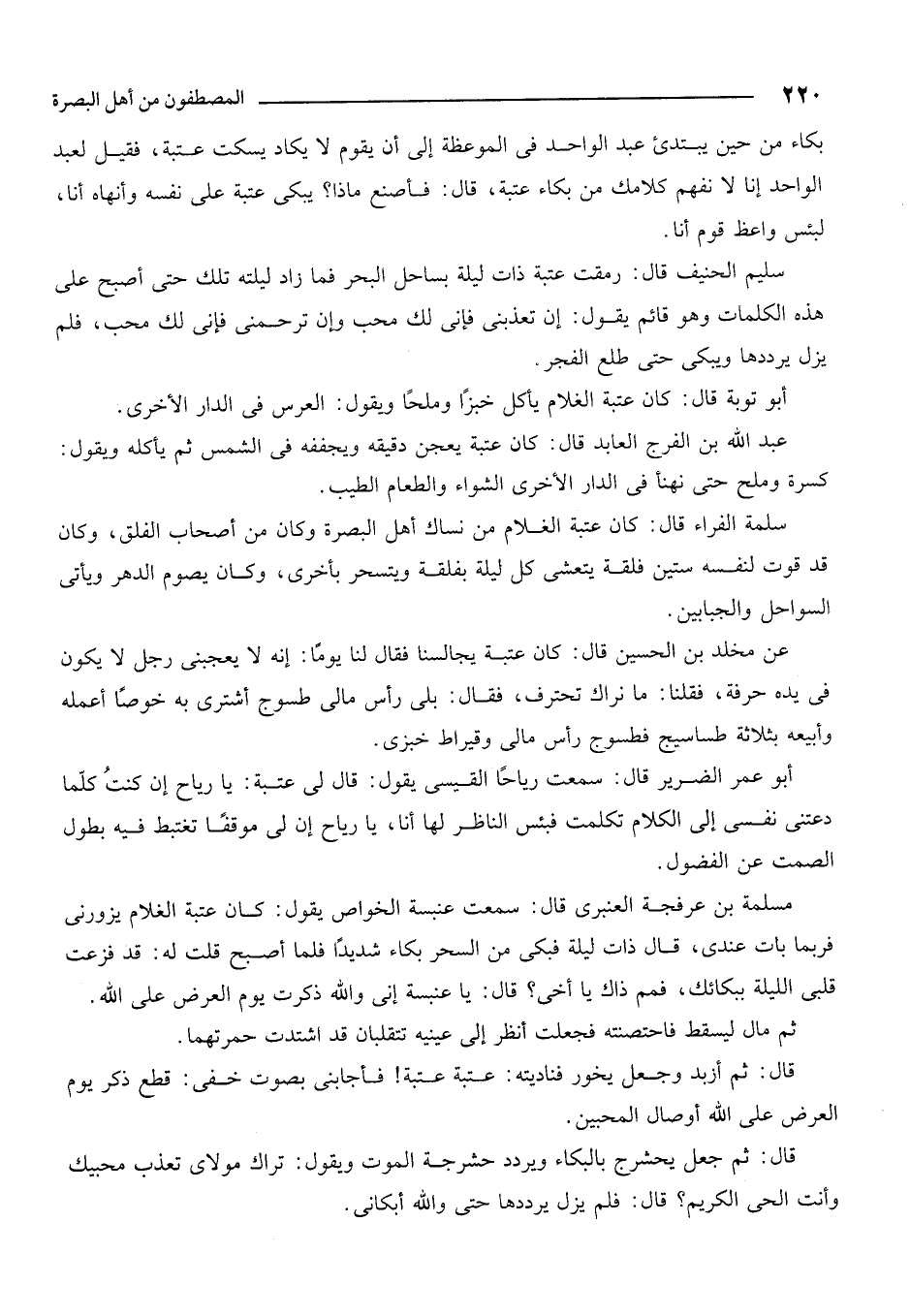 مسلمة بن عرفجة العنبري قال: سمعت عنبسة الخواص يقول: كان عتبة الغلام يزورني فربما بات عندي. قال ذات ليلة فبكى من السحر بكاءاً شديداً فلما أصبح قلت له: قد فزعت قلبي الليلة ببكائك. فمم ذاك يا أخي؟ قال: يا عنبسة إني والله ذكرت يوم العرض على الله.
