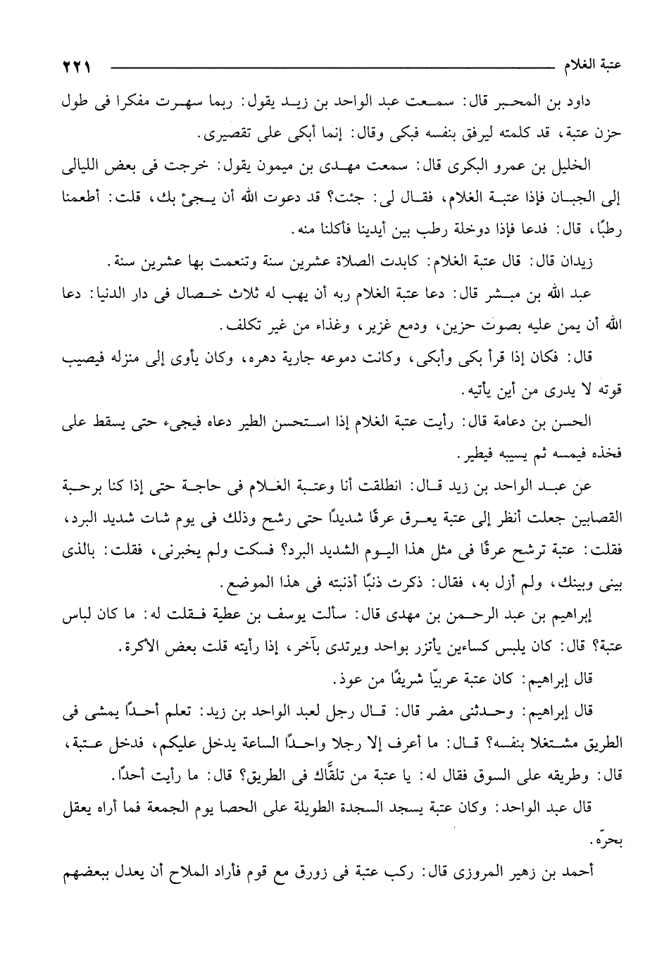 داود بن المحبر قال: سمعت عبد الواحد بن زيد يقول: ربما سهرت مفكراً في طول حزن عتبة، وقد كلمته ليرفق بنفسه فبكى وقال: إنما أبكي تقصيري.
